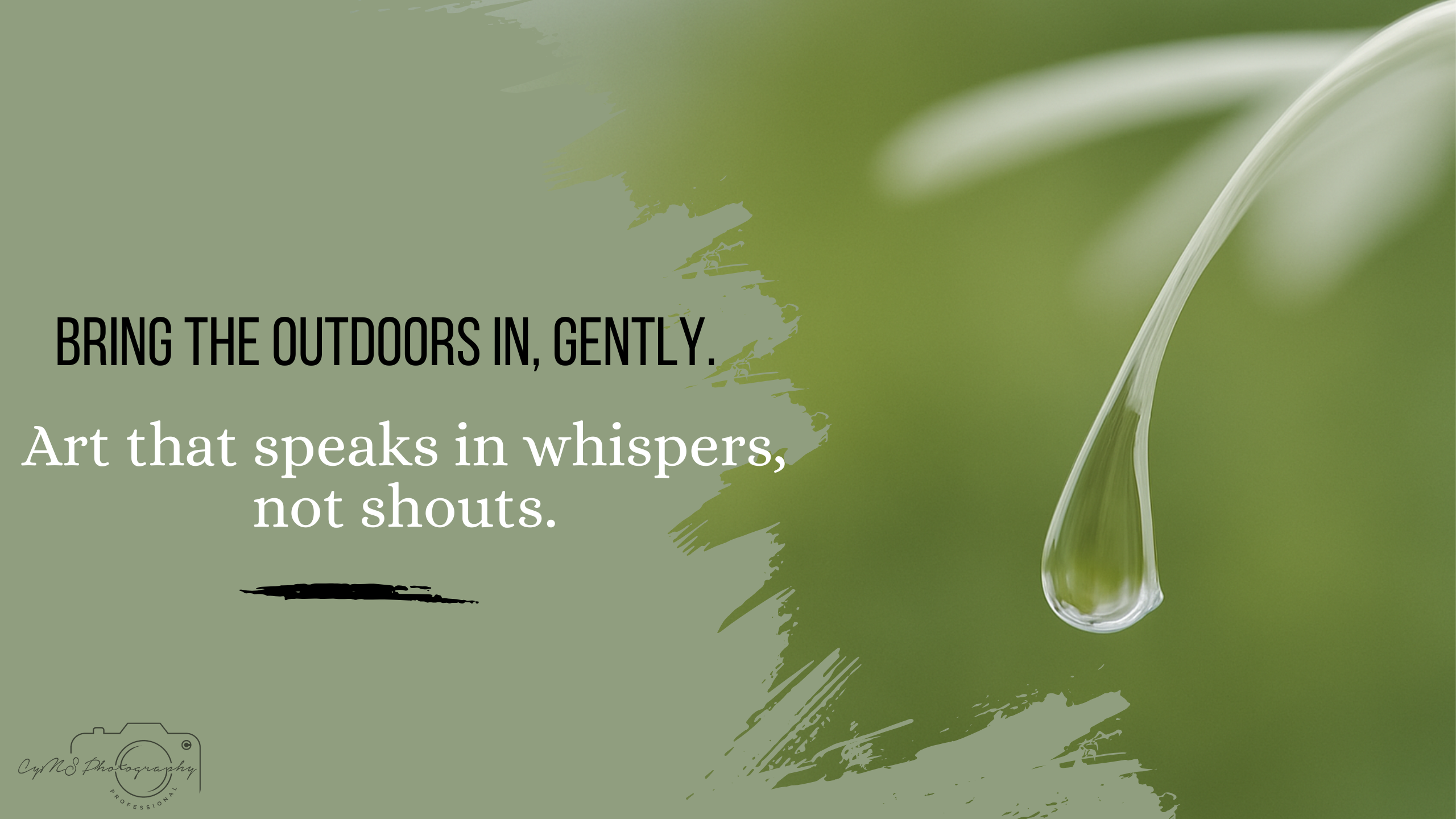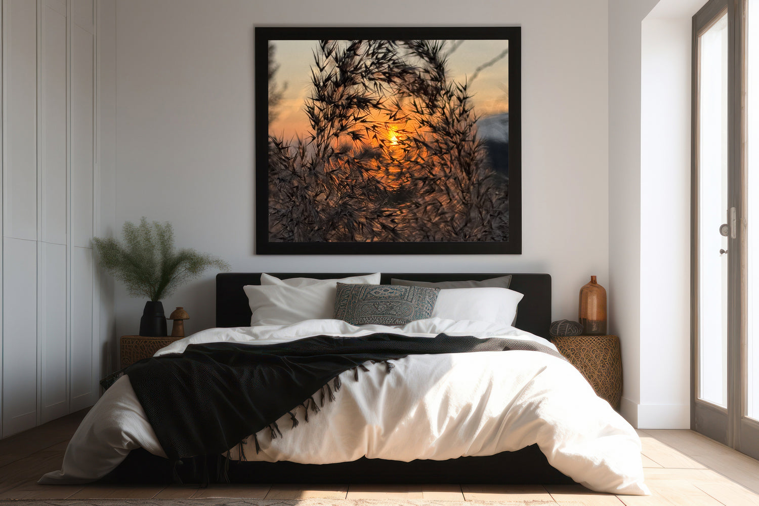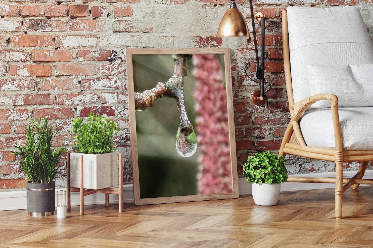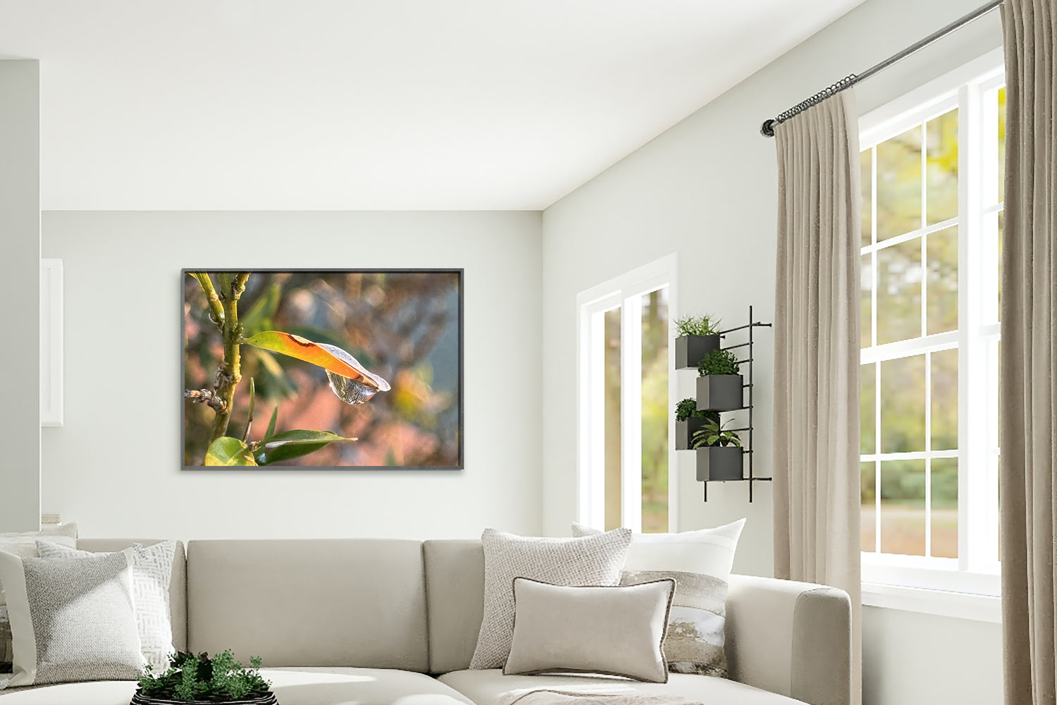 "In this living room frame, An Amazing Wonder adds elegance and calm. A delicate water droplet rests on the tip of a Phragmites australis, shimmering softly. Its warm tones blend beautifully with any space, capturing a fleeting moment of nature’s serenity. You can purchase this stunning piece by clicking on the link."