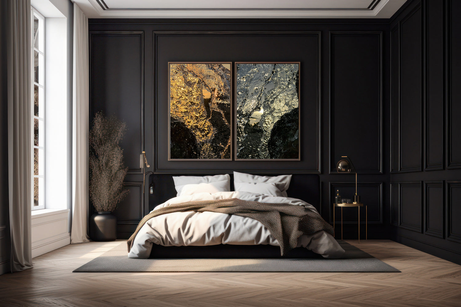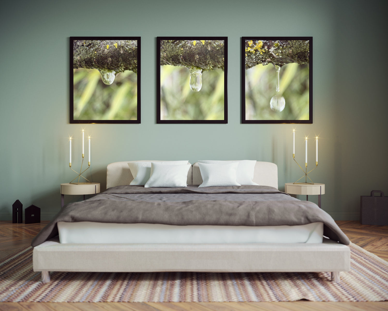 "In this bedroom, a stunning triptych frame showcases magnificent drops of water, their vivid light green hues creating an amazing visual impact. The pictures, capturing the beauty of nature, can be purchased in the 'Drops of Wonder' section."