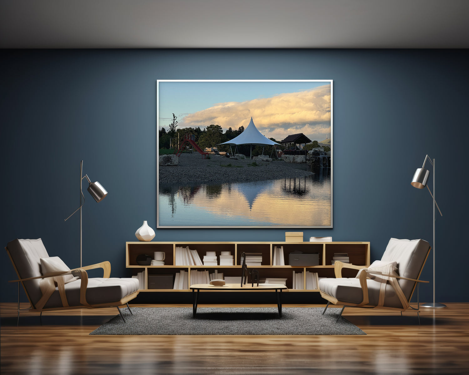 "This peaceful living room environment captures the serene beauty of a still lake, its surface perfectly mirroring the sky above. A cozy tent with an equilateral triangle shape rests at the water's edge, while soft white and cream clouds drift lazily across the sky. The tranquil scene creates a calming escape, harmonizing perfectly with nature. You can purchase this serene piece by clicking the link."