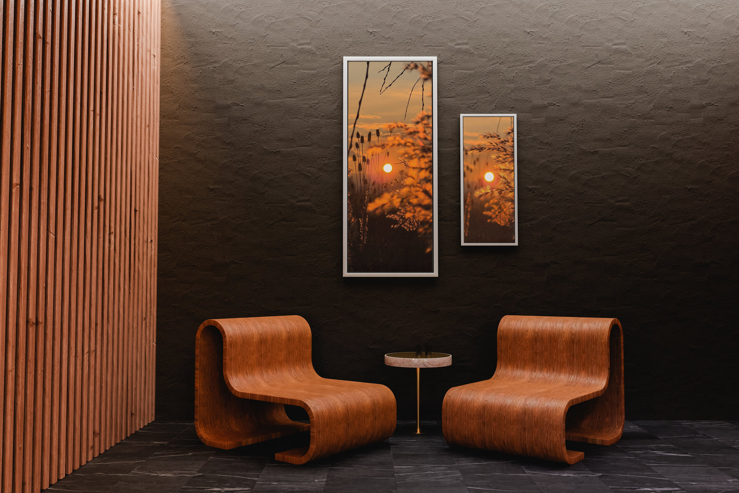 "In this waiting room, two picture frames of stunning sunsets grace the wall, adding a peaceful ambiance to the space. These captivating images can be purchased in the 'The Poetry of Sunsets' section."
