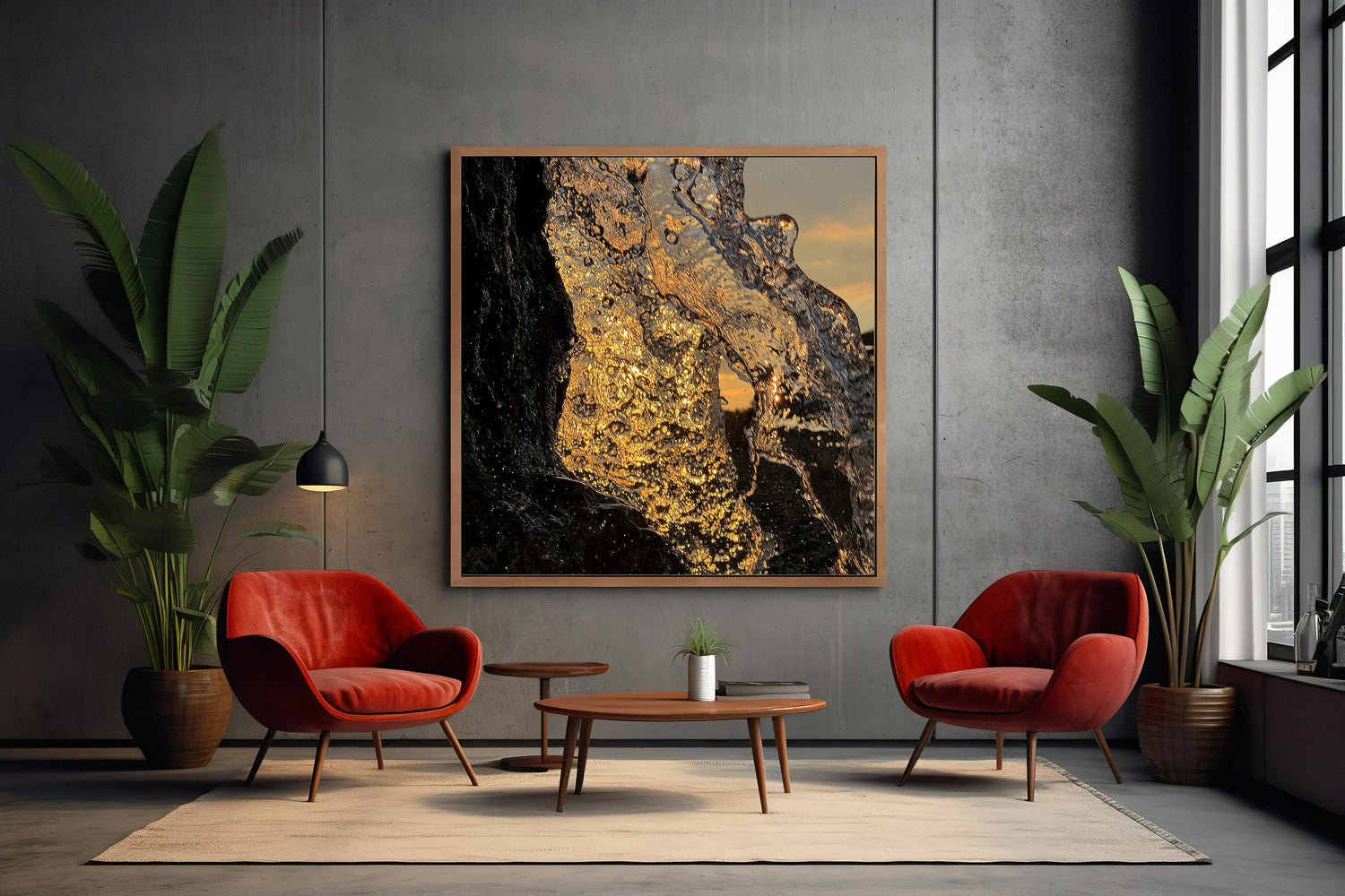 "The image showcased in the frame of this living room ambiance is from the 'Drops of Wonder' collection. It fits seamlessly into the space, adding elegance and tranquility. This stunning piece could beautifully enhance any interior if you choose to purchase the file."