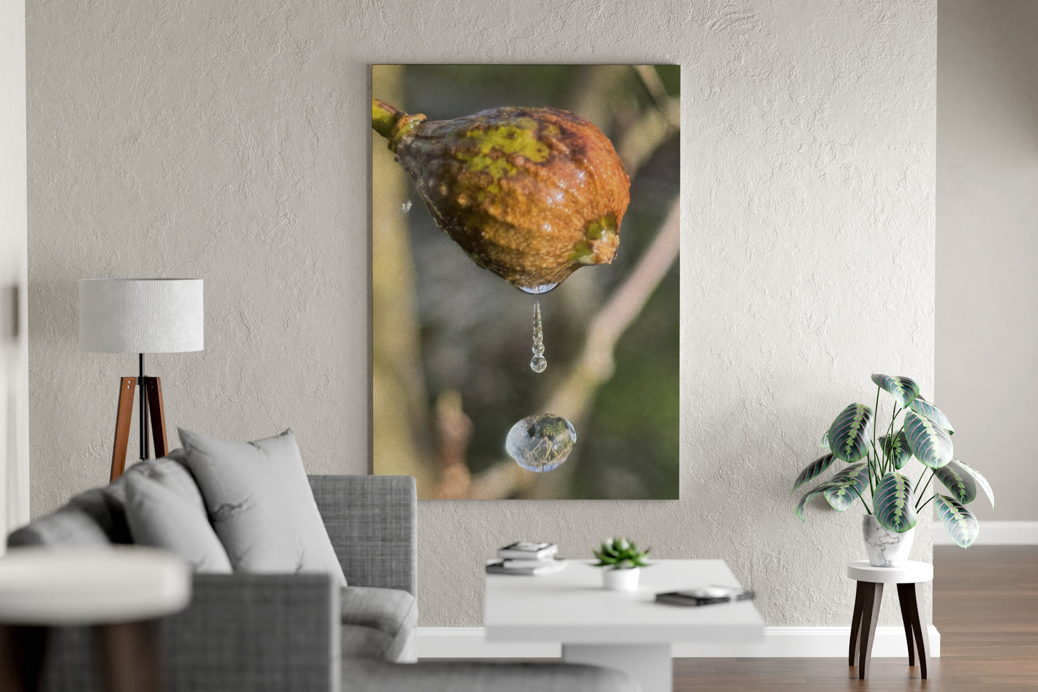 "An Amazing Wonder graces this living room frame with its stunning depiction of nature's beauty. A crystal-clear drop of water rests beneath a vibrant leaf of Buxus sempervirens, showcasing a vivid blend of fiery orange, fresh green, warm brown, and soft white. The droplet reflects its surroundings, capturing a fleeting moment before it disappears. Purchase this captivating piece by clicking the link."