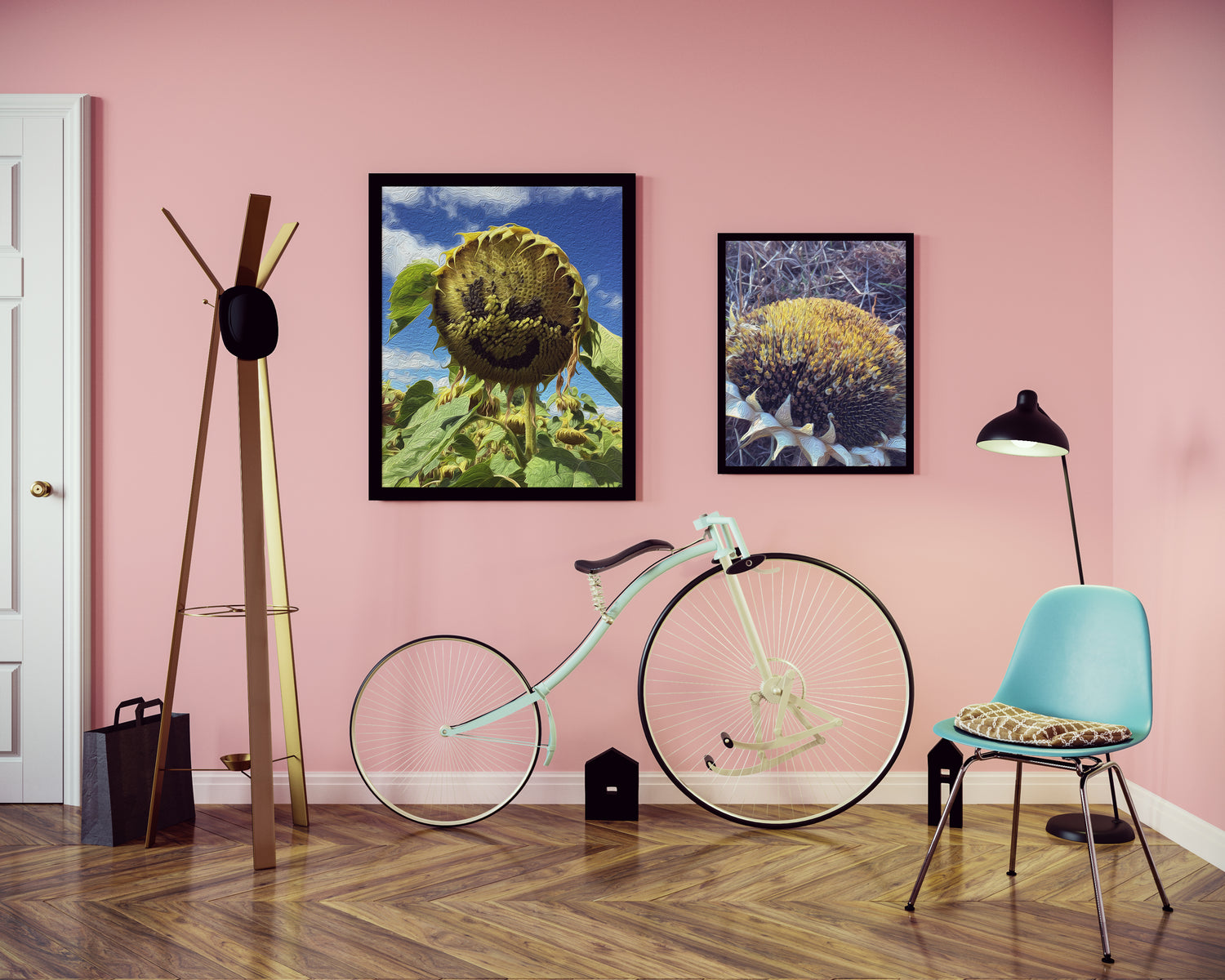 "In this room, two beautiful oil paintings of sunflowers adorn the walls. One depicts a sunflower with a smiley face, while the other shows a sunflower lying down in peaceful repose. These stunning oil paintings can be purchased in the 'Flower Blooms' collection."