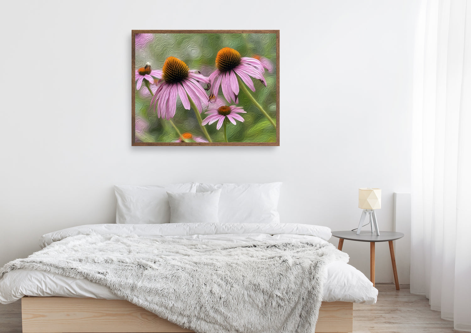 "The framed image of an Echinacea purpurea, or Purple Coneflower, brings a soothing touch to the space. The vibrant orange centers and soft pink-purple petals create a harmonious blend of warm and cool tones, radiating natural beauty and serenity. This tranquil scene adds a peaceful ambiance, perfect for a restful environment. You can purchase it by clicking the button below."