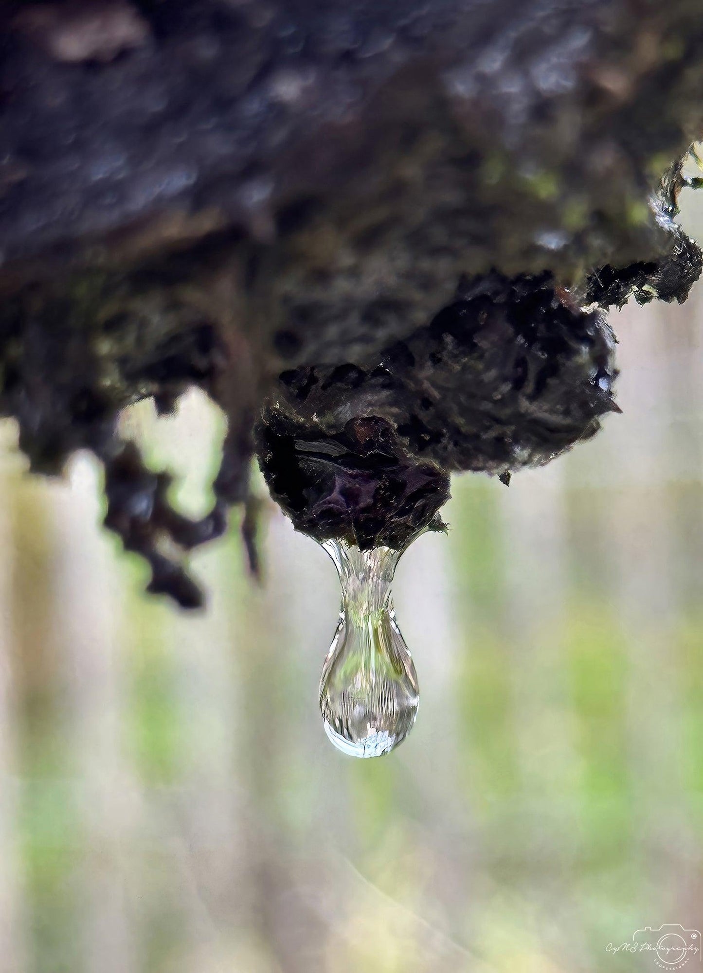 Une goutte d'eau, posée au bout d'une fine branche d'arbre, est sur le point de tomber. Sa surface vitreuse reflète les motifs complexes des feuilles et des branches environnantes, créant un tableau miniature et chatoyant. La forme de la goutte, accentuée par la pointe de la branche, ajoute une touche d'élégance naturelle à la scène. Ce moment fugace illustre la splendeur subtile du monde naturel, où même les plus petits éléments contribuent à un spectacle harmonieux et captivant.