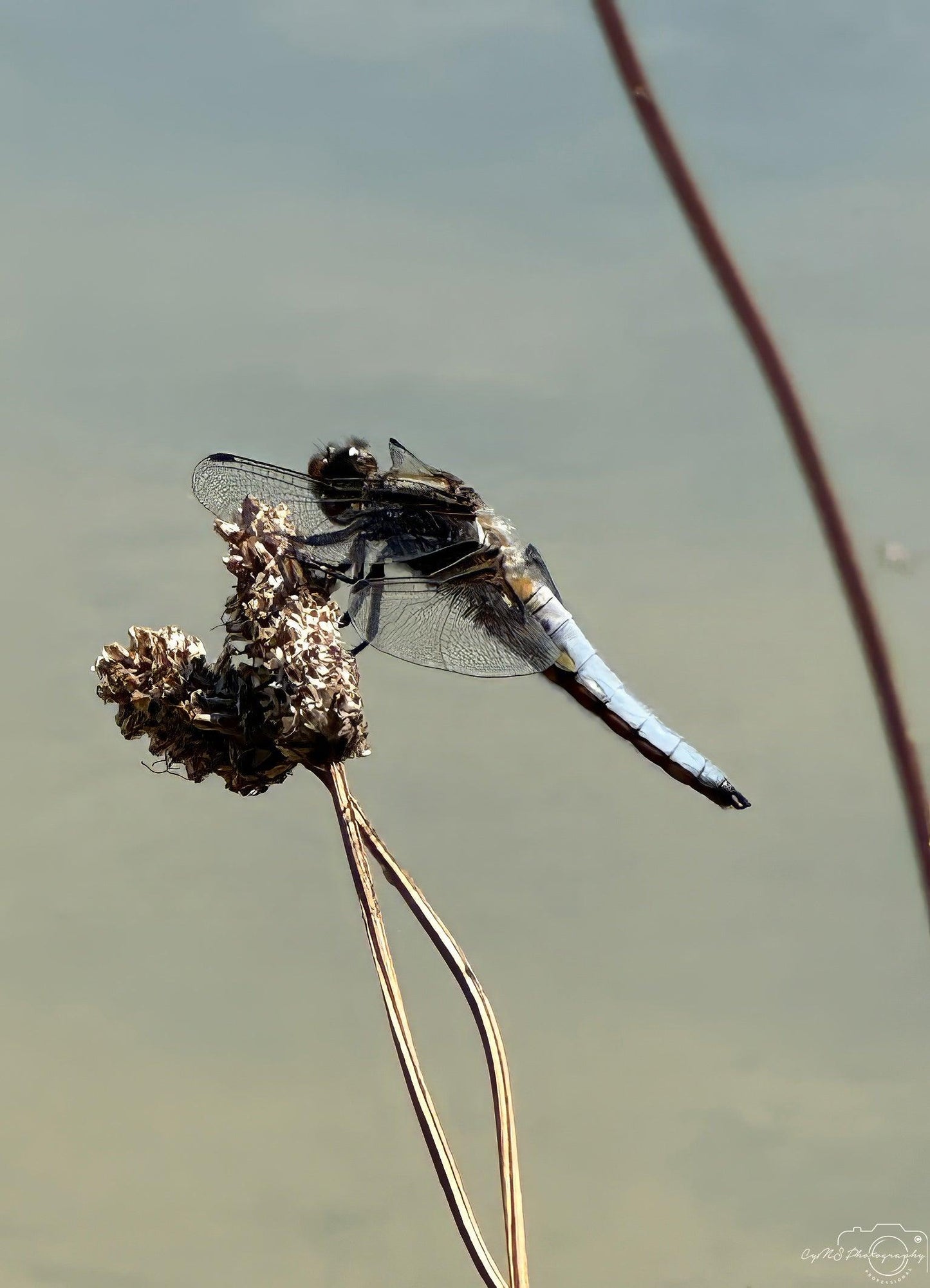 A dragonfly lies delicately on a tige near a tranquil frog pond, its wings gently resting as it takes a brief pause. The dragonfly’s body, a bright and vivid light blue, stands out beautifully against the surrounding greenery and the calm surface of the water. The vibrant hue of its body catches the light, adding an ethereal touch to the scene. As it rests on the tige, the dragonfly seems to be in perfect harmony with its surroundings, a moment of stillness in the otherwise lively pond ecosystem.