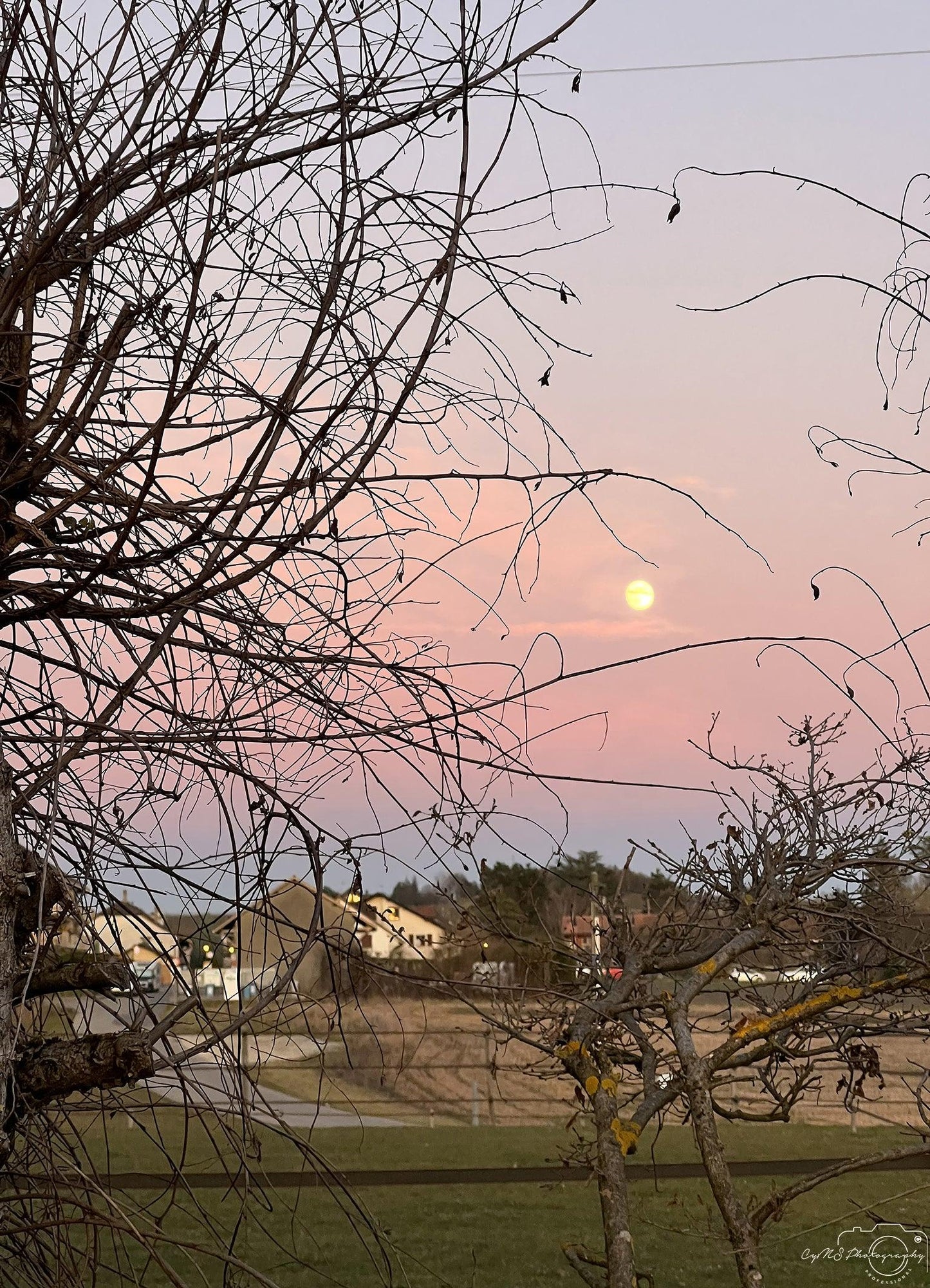 The moon sits at the center of the picture, its subtle form visible against a sky painted in a rare, almost magical shade of pink. The sky gradually fades into soft gradients, creating a dreamy, ethereal atmosphere. Thin tree branches frame both sides of the image, their delicate shapes silhouetted against the serene backdrop. Though the moon doesn’t glow yet, its presence is undeniable, surrounded by the tranquil beauty of the pink-hued sky. The entire scene feels calm and expectant, as nature holds its breath, awaiting the moon’s full brilliance.