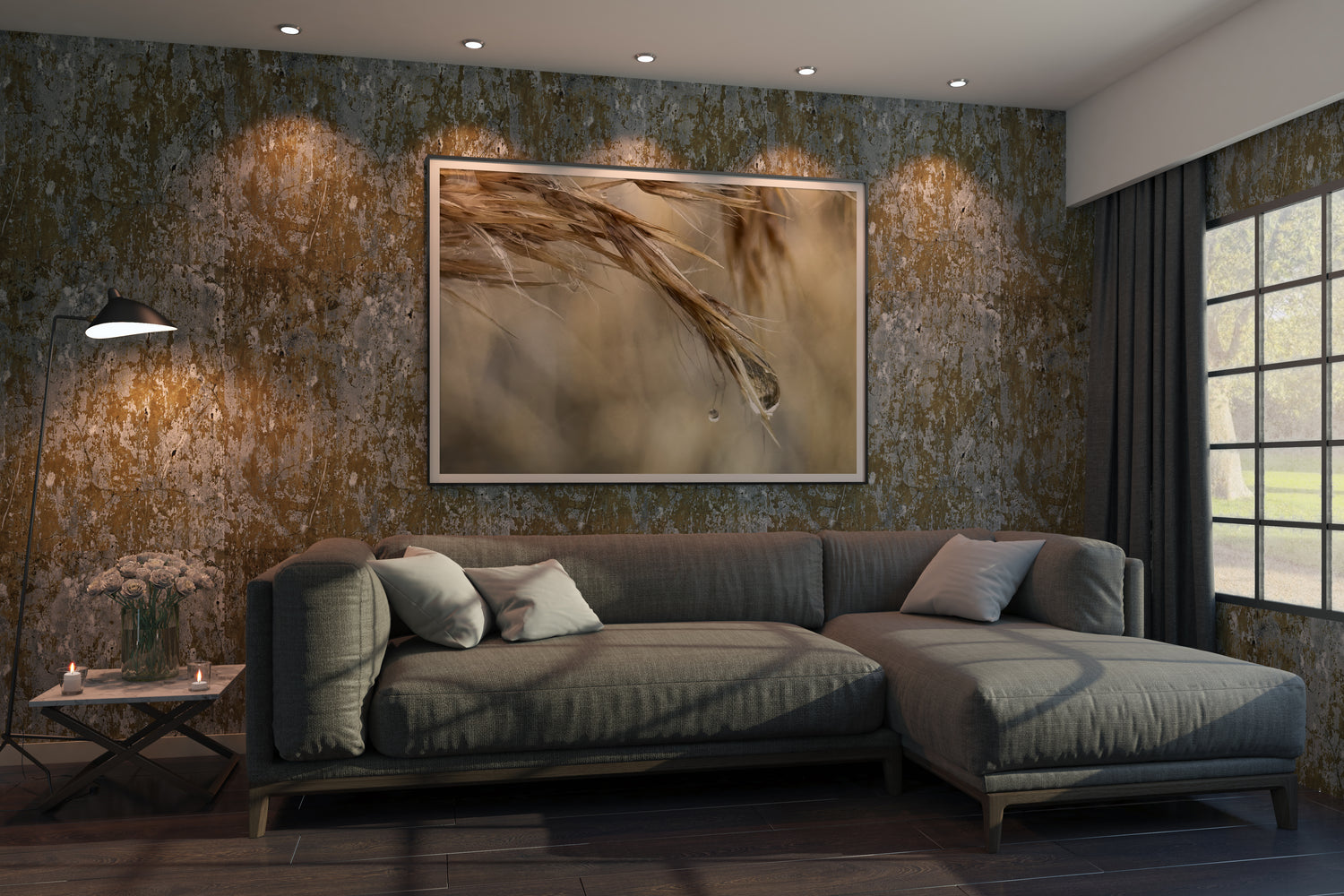 "In this living room frame, An Amazing Wonder adds elegance and calm. A delicate water droplet rests on the tip of a Phragmites australis, shimmering softly. Its warm tones blend beautifully with any space, capturing a fleeting moment of nature’s serenity. You can purchase this stunning piece by clicking on the link."