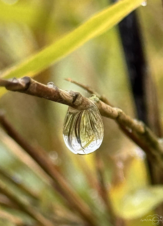 On an Alnus glutinosa, also known as Imperialis, a delicate drop of water rests, its crystal-clear surface capturing the surrounding beauty. Within its tiny, reflective core, the long reddish strobiles are perfectly mirrored, their intricate details distorted yet mesmerizing. Poised in perfect stillness, the droplet clings to the branch, highlighting the subtle elegance of nature’s design.