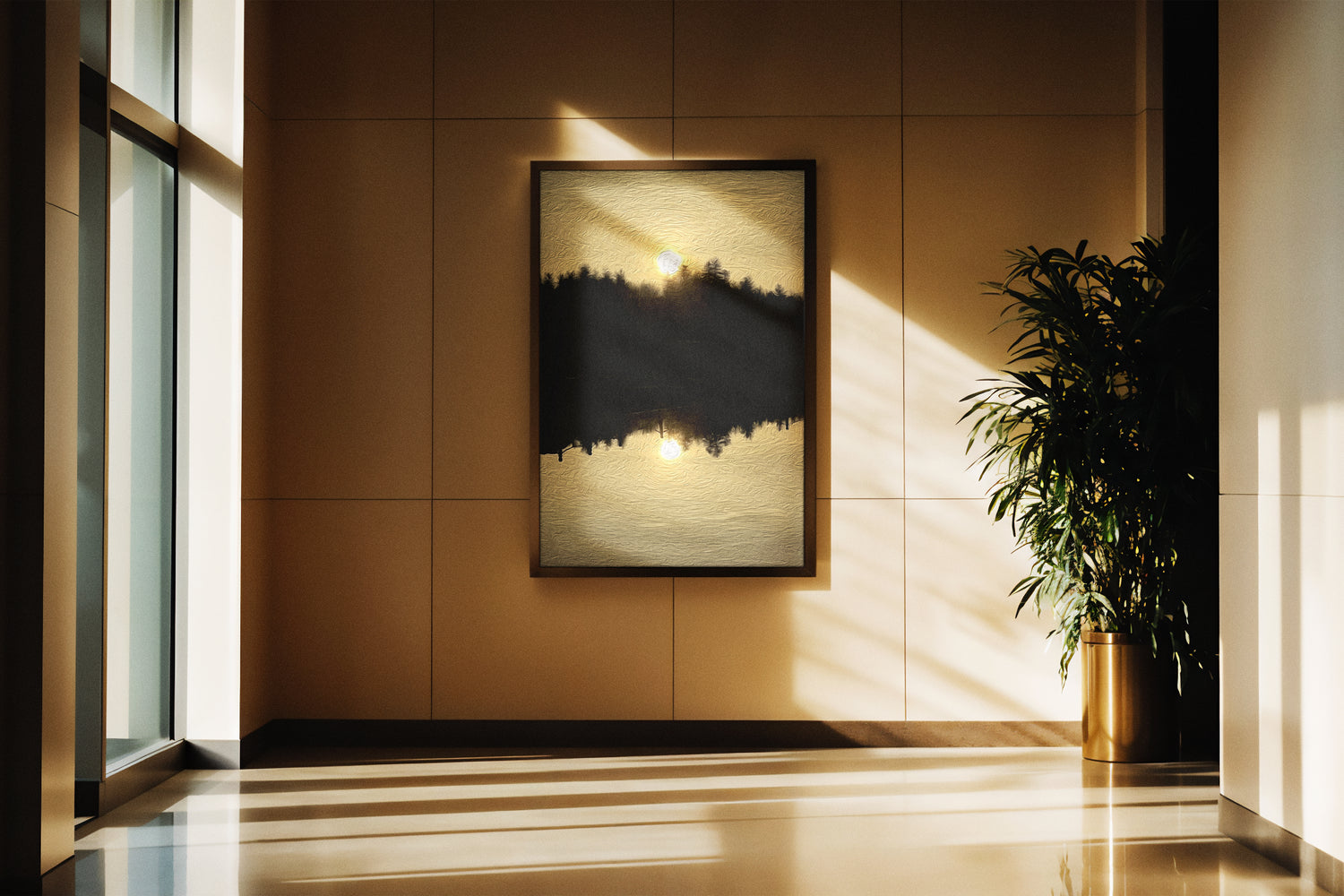 "In the quiet of the morning, the lake’s calm surface reflects the sun's golden glow, stretching across the water. Soft pastel hues fill the sky, warming as the day starts. The tranquil, mirror-like water creates a serene, dreamlike atmosphere, blurring the line between sky and lake—perfect for an office hall environment. Click the link to purchase."