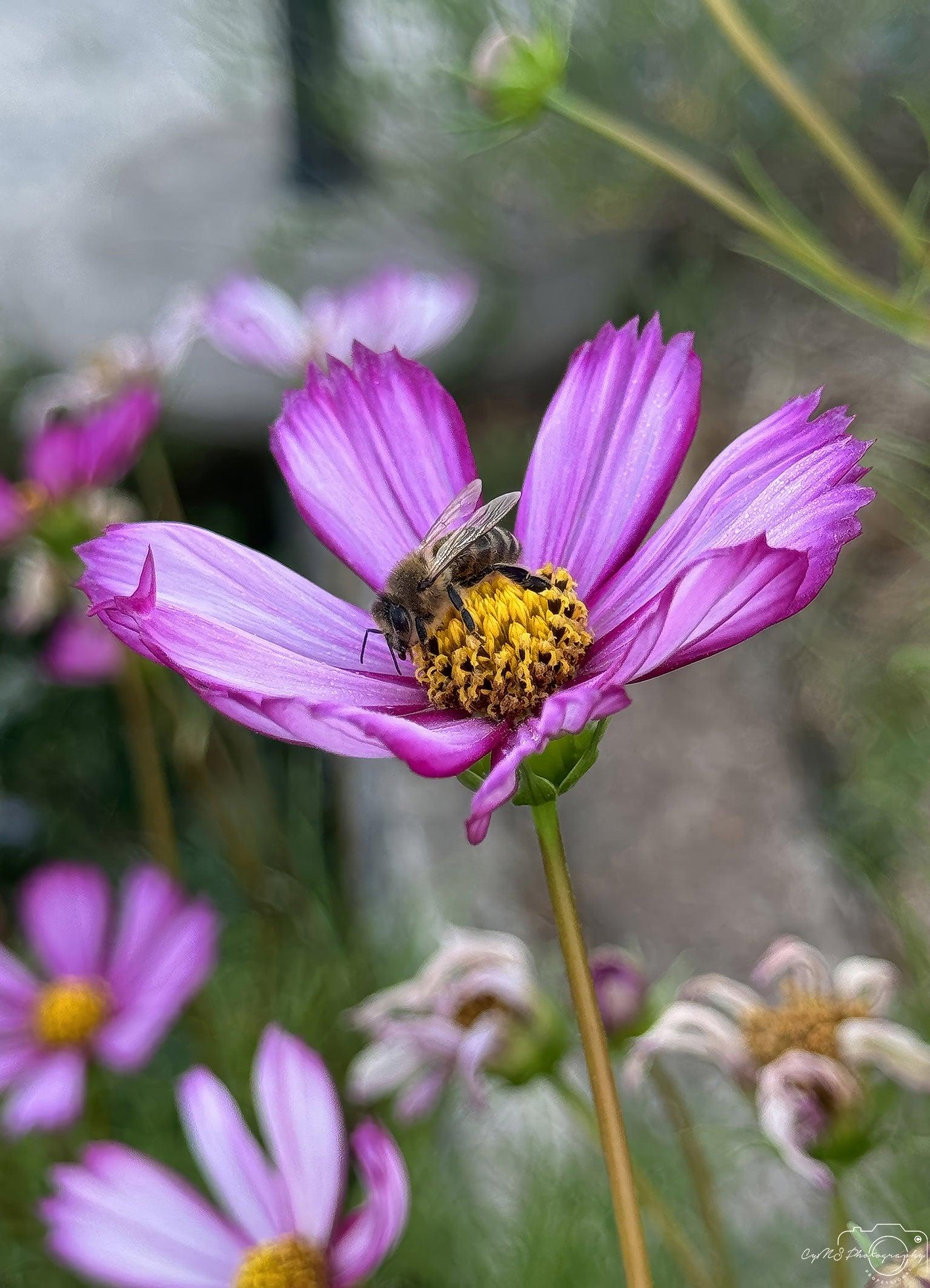 Diese bezaubernde Aufnahme zeigt eine Biene beim Nektarsammeln an einer leuchtend hellvioletten Kosmee . Die zarten, lavendelfarbenen Blütenblätter bilden einen zarten Kontrast zum goldenen Flaum der Biene, die sich anmutig von einer Blüte zur nächsten bewegt. Der hellviolette Farbton der Blüte, der im Sonnenlicht fast leuchtet, verleiht der Szene eine ruhige und sanfte Note. Dieses Bild zeigt auf wunderschöne Weise die enge Verbindung zwischen Biene und Blüte und unterstreicht die Bedeutung dieser zarten und doch lebenswichtigen Interaktion in der Natur.