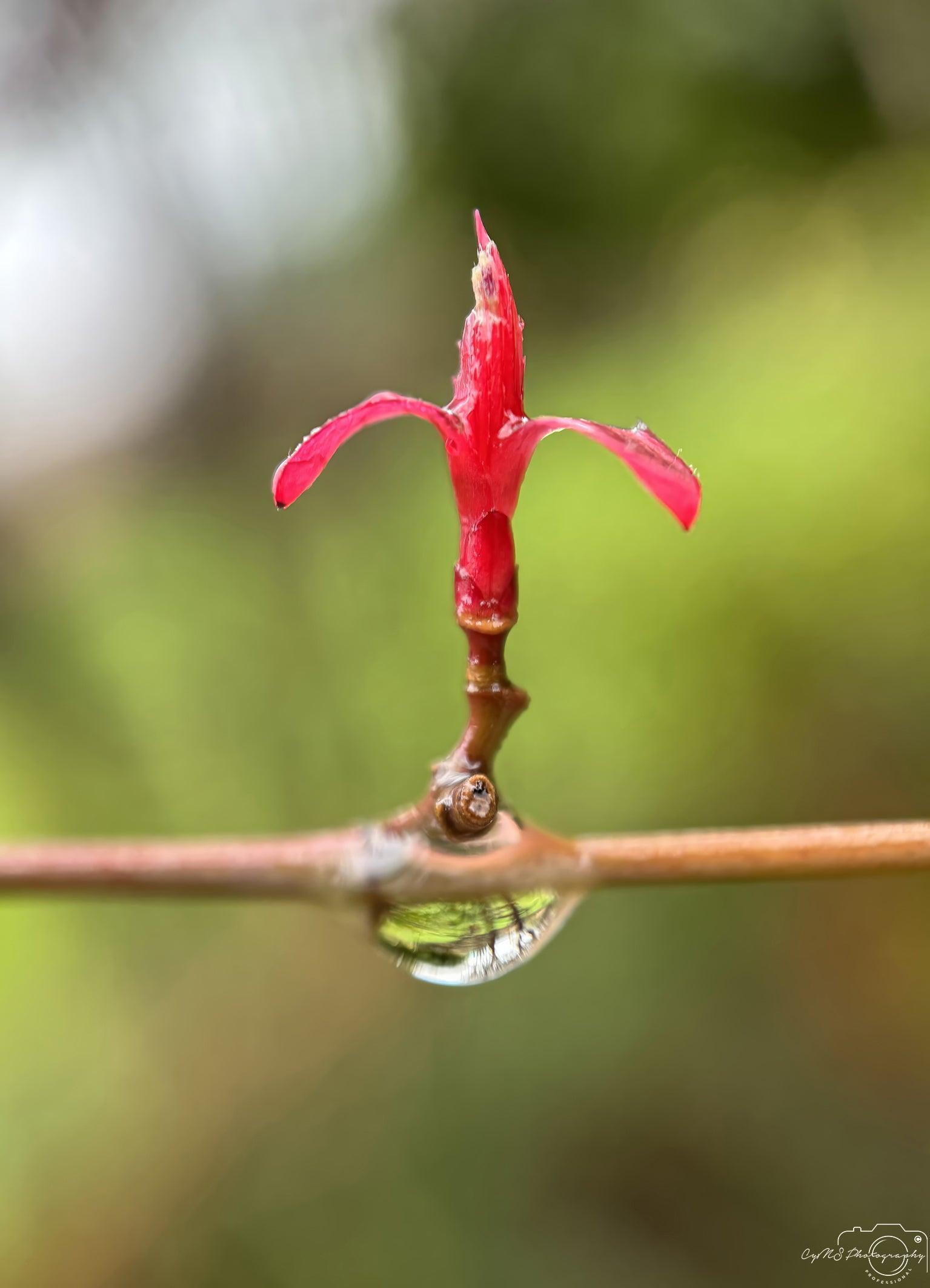 Ein einzelner Wassertropfen haftet unter der Kopsia fruticosa und spiegelt ihre engelhafte Gestalt wider. Die leuchtend dunkelrosa Blütenblätter leuchten darüber und werfen einen sanften Farbton auf den zitternden Tropfen. Er birgt einen flüchtigen Moment der Reinheit und spiegelt Himmel und Erde wider.