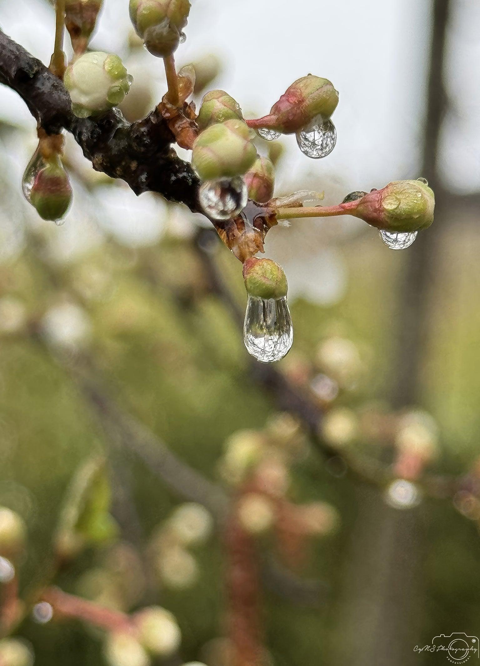 Unzählige Tropfen haften an der Myrobolane (Prunus) und schimmern wie kleine Sterne unter ihren Zweigen. Die tief gefärbten Blüten und Blätter des Baumes umrahmen die Kristallperlen, die jeweils die Welt im Kleinen widerspiegeln. Sie zittern im Wind und enthalten flüchtige Flüstertöne von Himmel und Erde.
