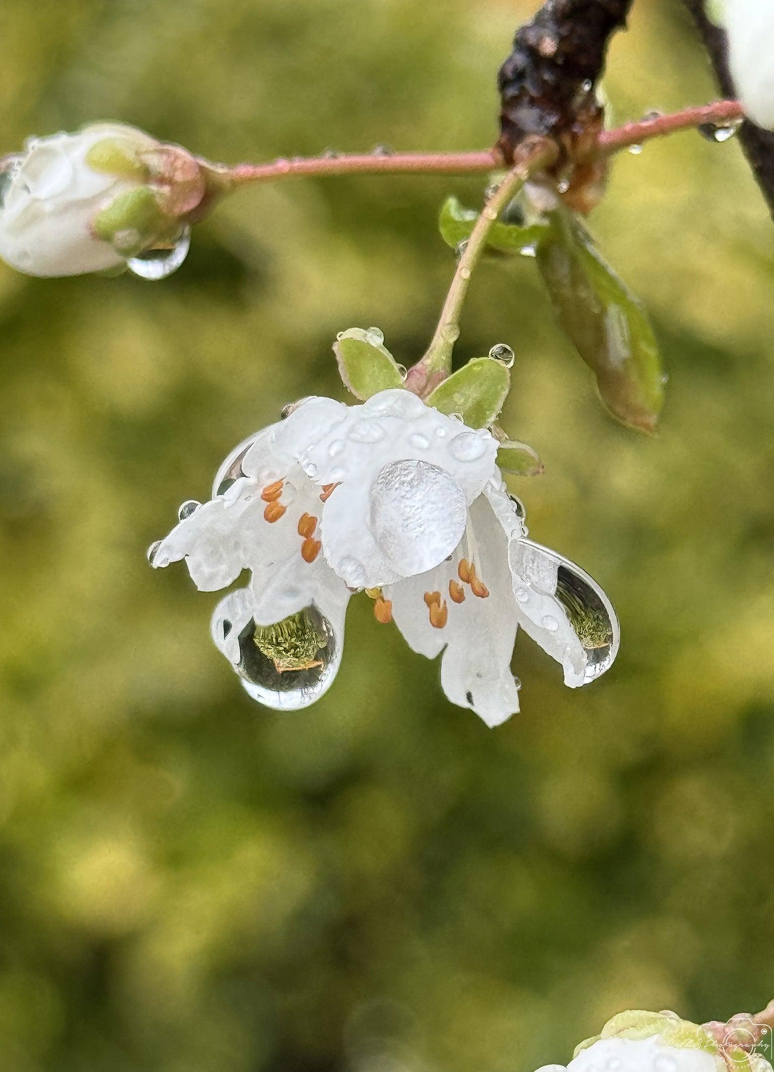 Unzählige Tropfen haften an der Myrobolane (Prunus) und schimmern wie kleine Sterne unter ihren Zweigen. Die tief gefärbten Blüten und Blätter des Baumes umrahmen die Kristallperlen, die jeweils die Welt im Kleinen widerspiegeln. Sie zittern im Wind und enthalten flüchtige Flüstertöne von Himmel und Erde.