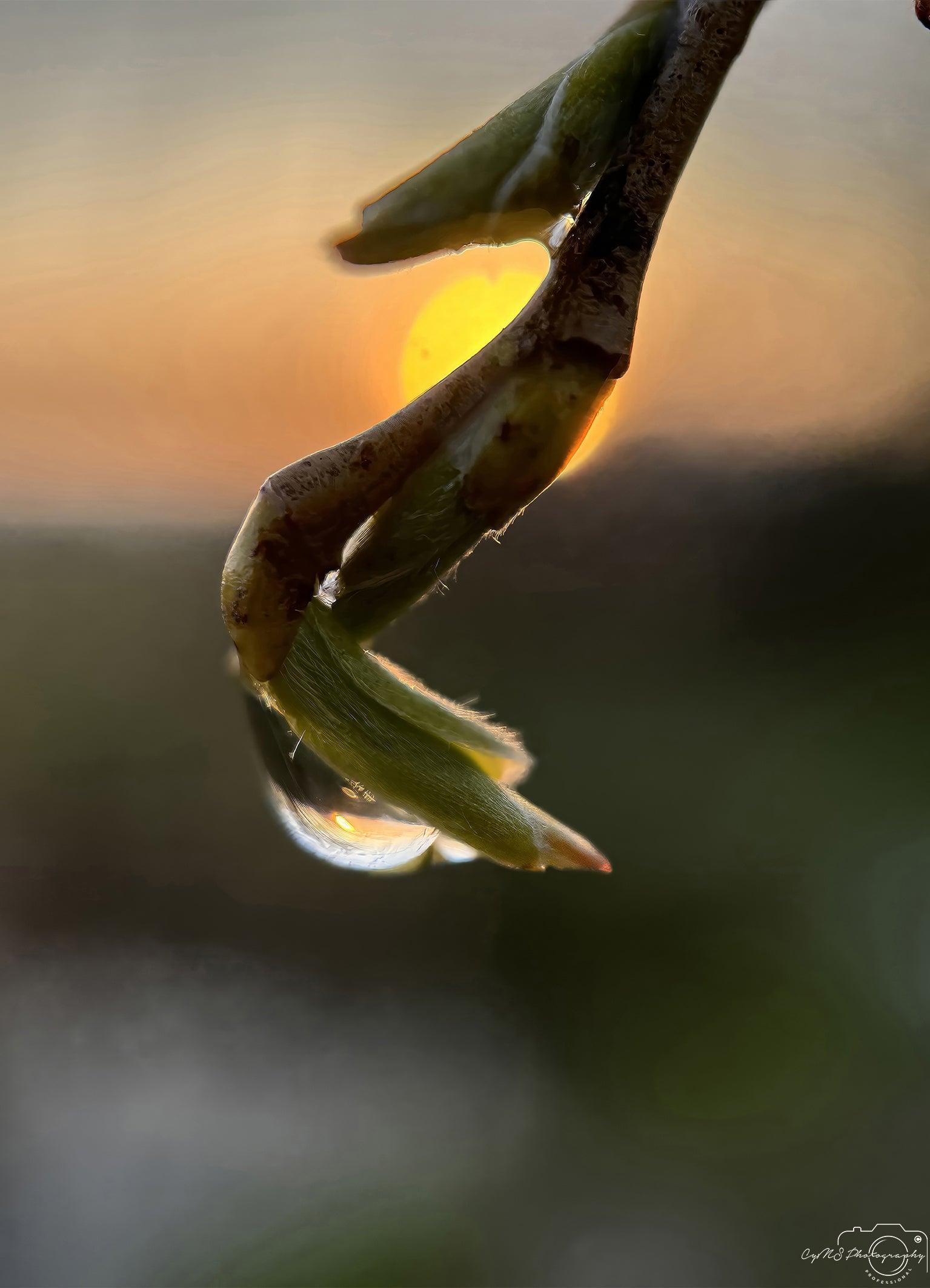 Unter einem Blatt der Salix babylonica liegt ein prächtiger, perfekt abgerundeter Tropfen, gehalten von einer handähnlichen Form, die das Blatt sanft auffängt, damit es nicht herunterfällt. Die Szene spielt bei Sonnenuntergang, wobei der Tropfen die Sonne einfängt und das warme, goldene Licht reflektiert. Die ruhige Schönheit des Augenblicks verstärkt die friedliche Atmosphäre, da der Tropfen sowohl die Sonne als auch die Ruhe der Natur in vollkommener Stille festhält.