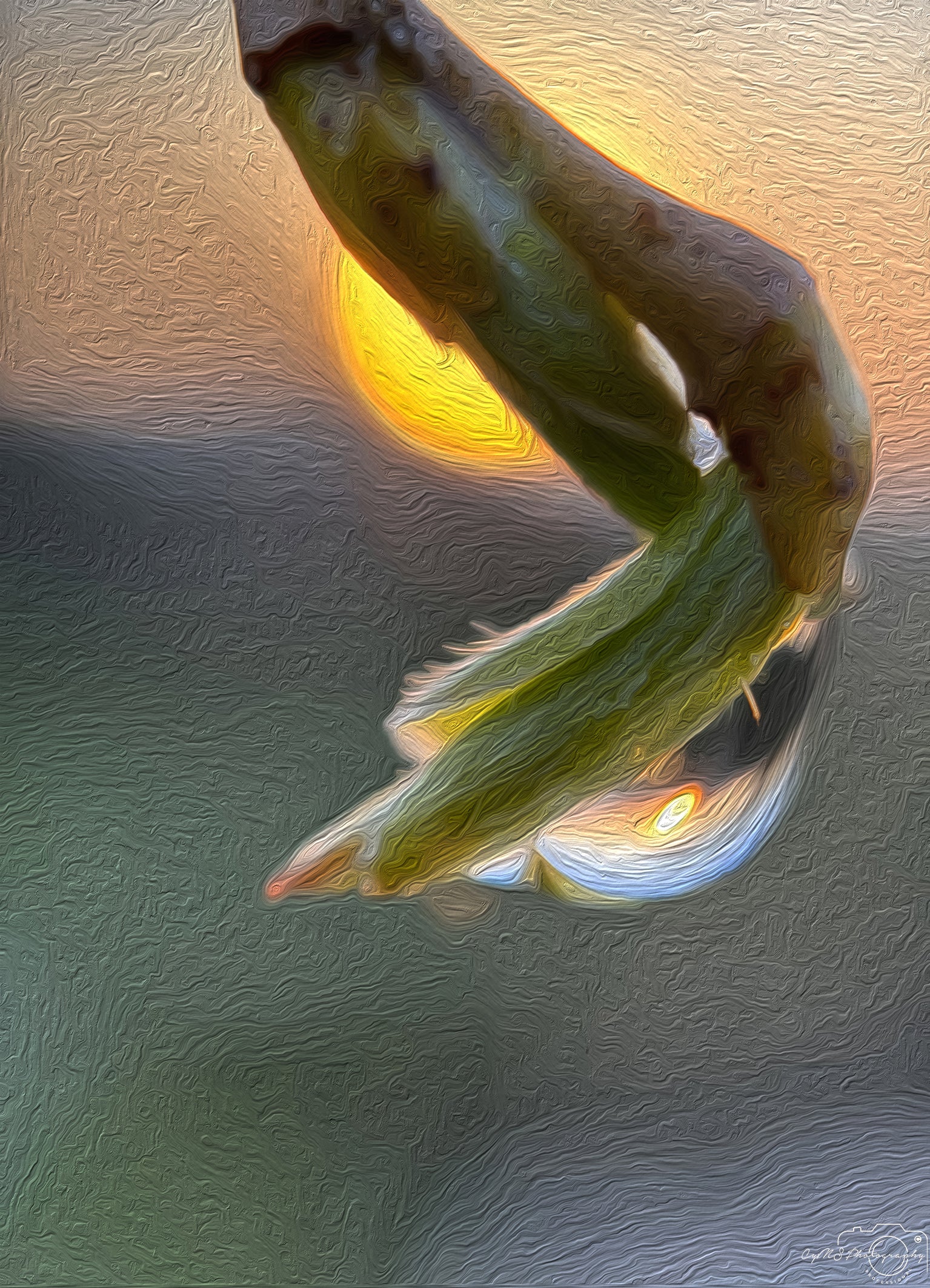 Unter einem Blatt der Salix babylonica liegt ein prächtiger, perfekt abgerundeter Tropfen, gehalten von einer handähnlichen Form, die das Blatt sanft auffängt, damit es nicht herunterfällt. Die Szene spielt bei Sonnenuntergang, wobei der Tropfen die Sonne einfängt und das warme, goldene Licht reflektiert. Die ruhige Schönheit des Augenblicks verstärkt die friedliche Atmosphäre, da der Tropfen sowohl die Sonne als auch die Ruhe der Natur in vollkommener Stille festhält.