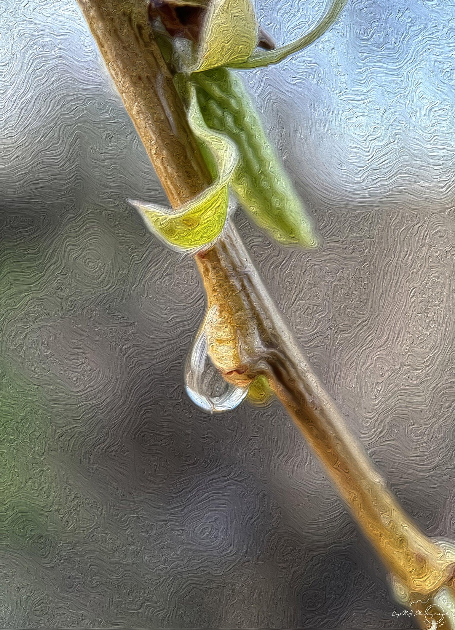 An der Verzweigung eines Zweiges der Salix babylonica ruht zart ein Tropfen. Der Tropfen fängt das sanfte Licht der Szene ein und spiegelt die sanfte Verheißung neuen Lebens wider. Umgeben von der subtilen Textur des Zweiges symbolisiert er einen ruhigen Moment der Stille und Erneuerung in der Natur.
