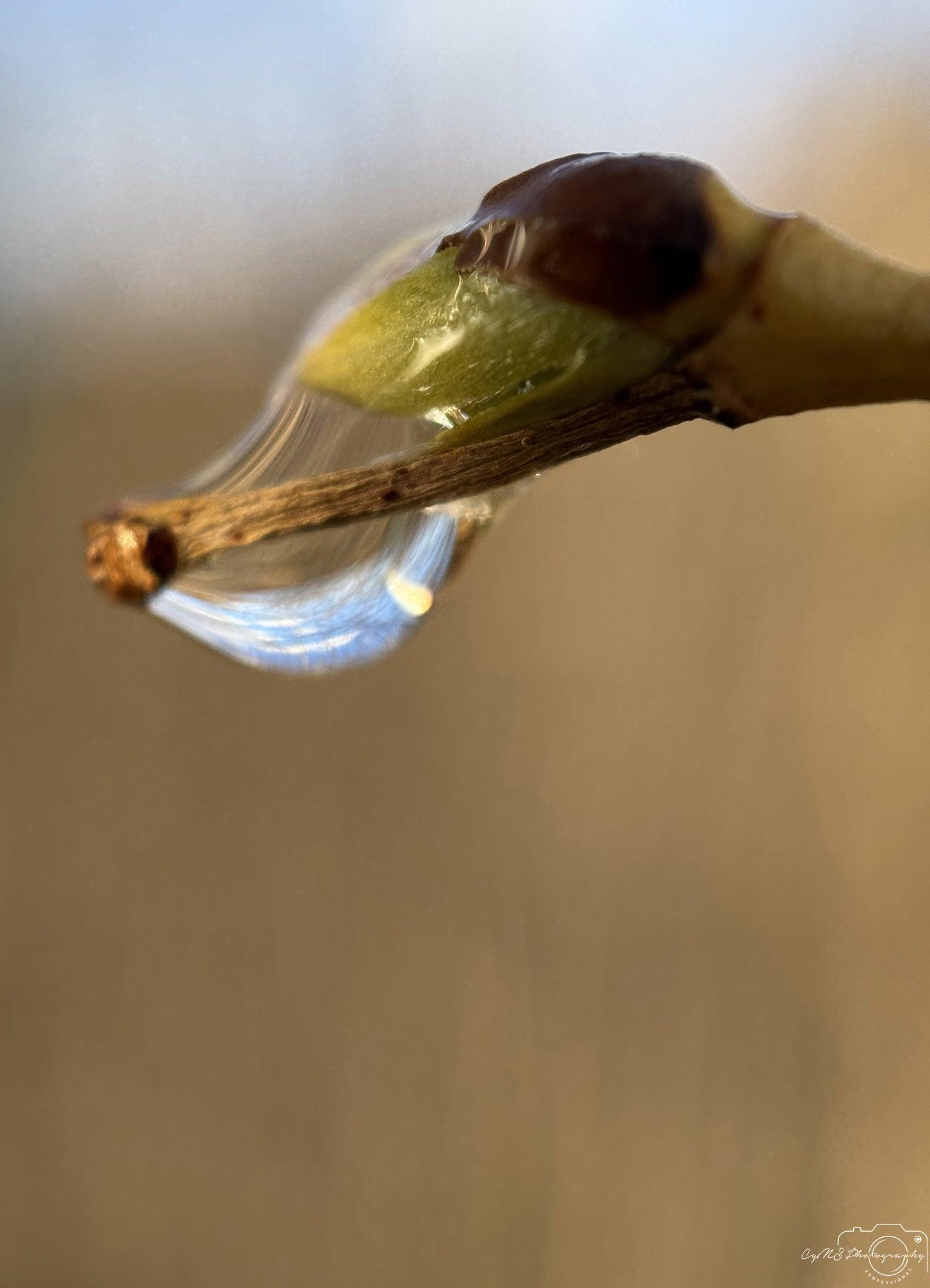 An der Spitze einer unbekannten Pflanze liegt ein Tropfen, der perfekt mit dem Ast verschmilzt. Die Spitze des Astes weist Grün- und Brauntöne auf, während der Ast selbst in einem sanften Hellbraun gehalten ist. Die Szene erinnert an einen Entenkopf mit dem Tropfen in der Mitte und erzeugt so eine erstaunliche und unerwartete natürliche Ähnlichkeit.
