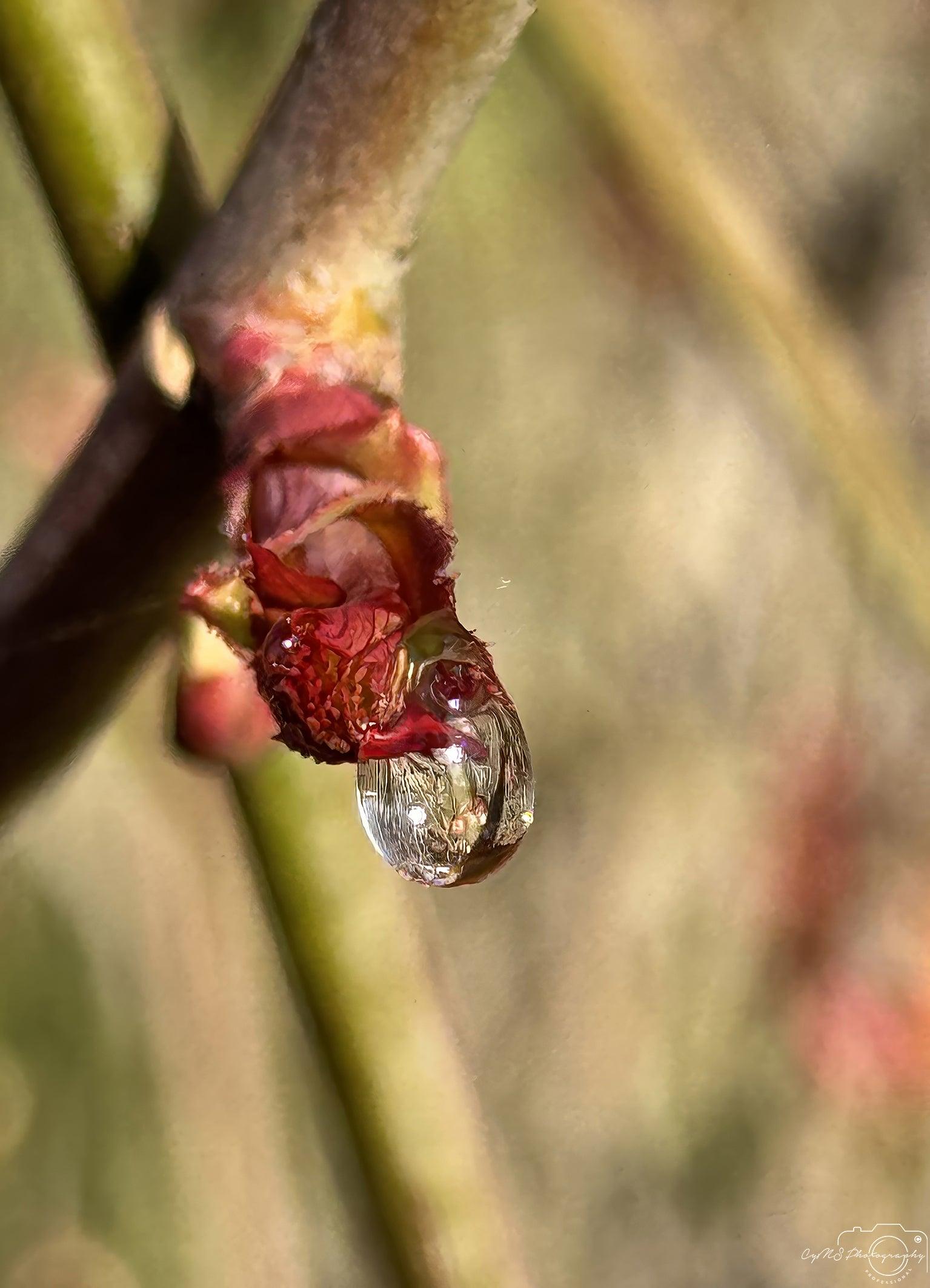 An der Spitze der Knospe der Chaenomeles japonica sitzt ein großer Tropfen, dessen leuchtend rote Farbe wunderschön hervorsticht. Der Tropfen spiegelt die Umgebung klar wider und fängt die Details und Schärfe des Augenblicks ein, während die knospende Blüte der Szene einen Hauch von Eleganz verleiht.