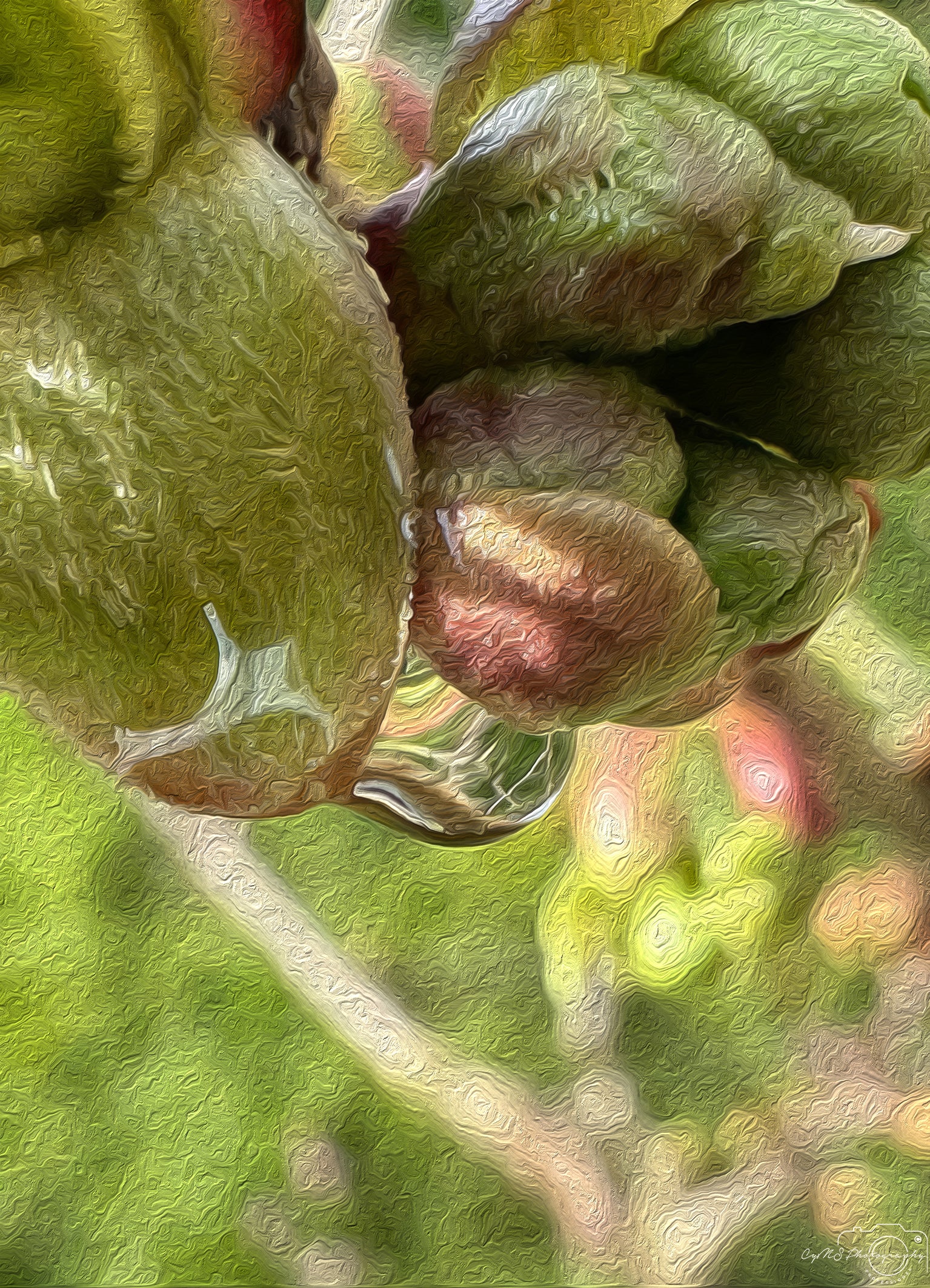 Ein einzelner Wassertropfen liegt neben den Knospen einer unbekannten Pflanze und schimmert wie ein winziger Kristall. Seine zarte Oberfläche fängt die Welt um ihn herum ein und reflektiert sanfte Grün- und Rosatöne. Licht tanzt im Inneren und vermischt Farben zu einem flüchtigen, flüssigen Mosaik, bevor der Tropfen langsam dem sanften Rhythmus der Natur erliegt.
