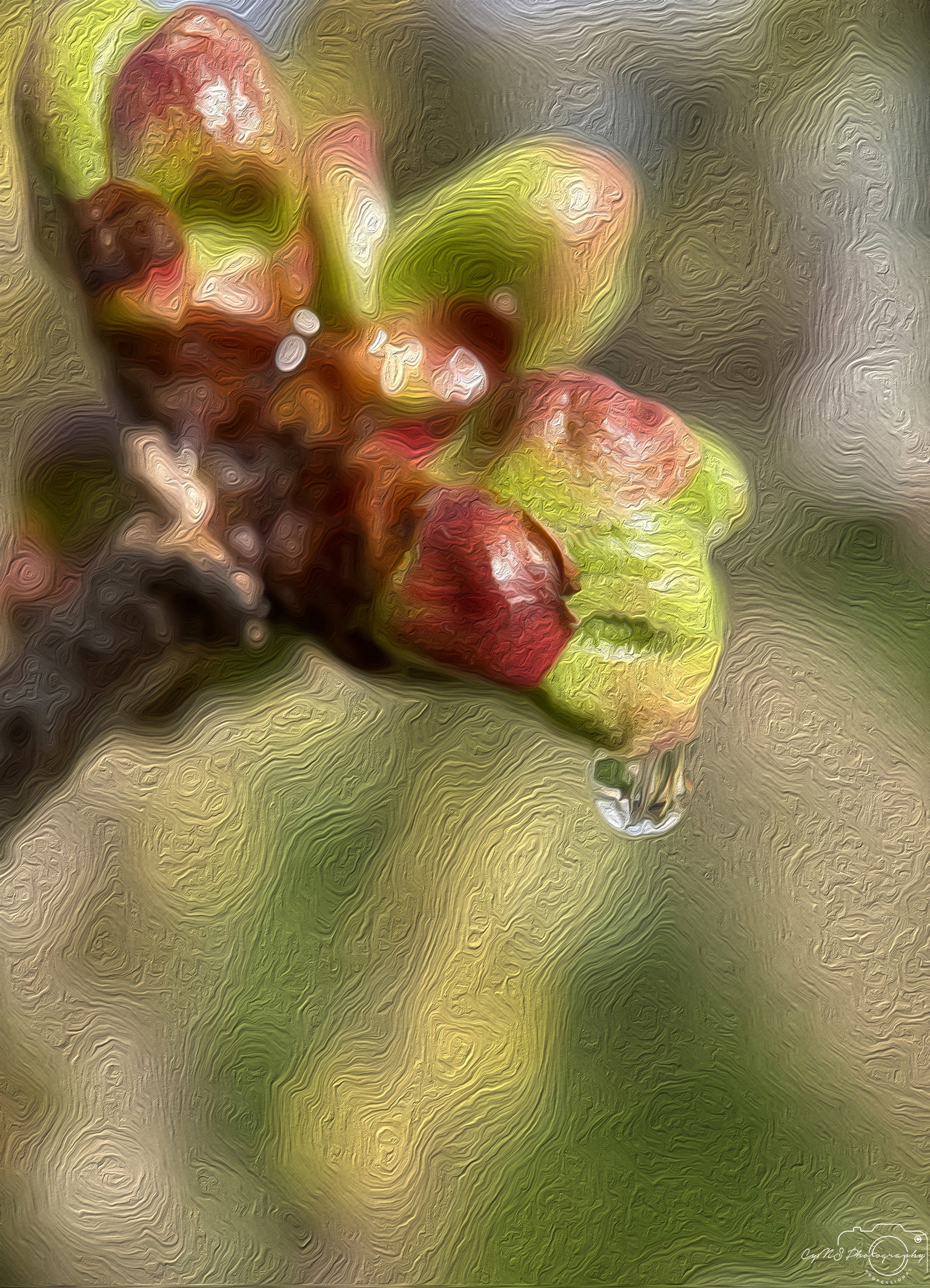 Ein einzelner Wassertropfen liegt neben den Knospen einer unbekannten Pflanze und schimmert wie ein winziger Kristall. Seine zarte Oberfläche fängt die Welt um ihn herum ein und reflektiert sanfte Grün- und Rosatöne. Licht tanzt im Inneren und vermischt Farben zu einem flüchtigen, flüssigen Mosaik, bevor der Tropfen langsam dem sanften Rhythmus der Natur erliegt.
