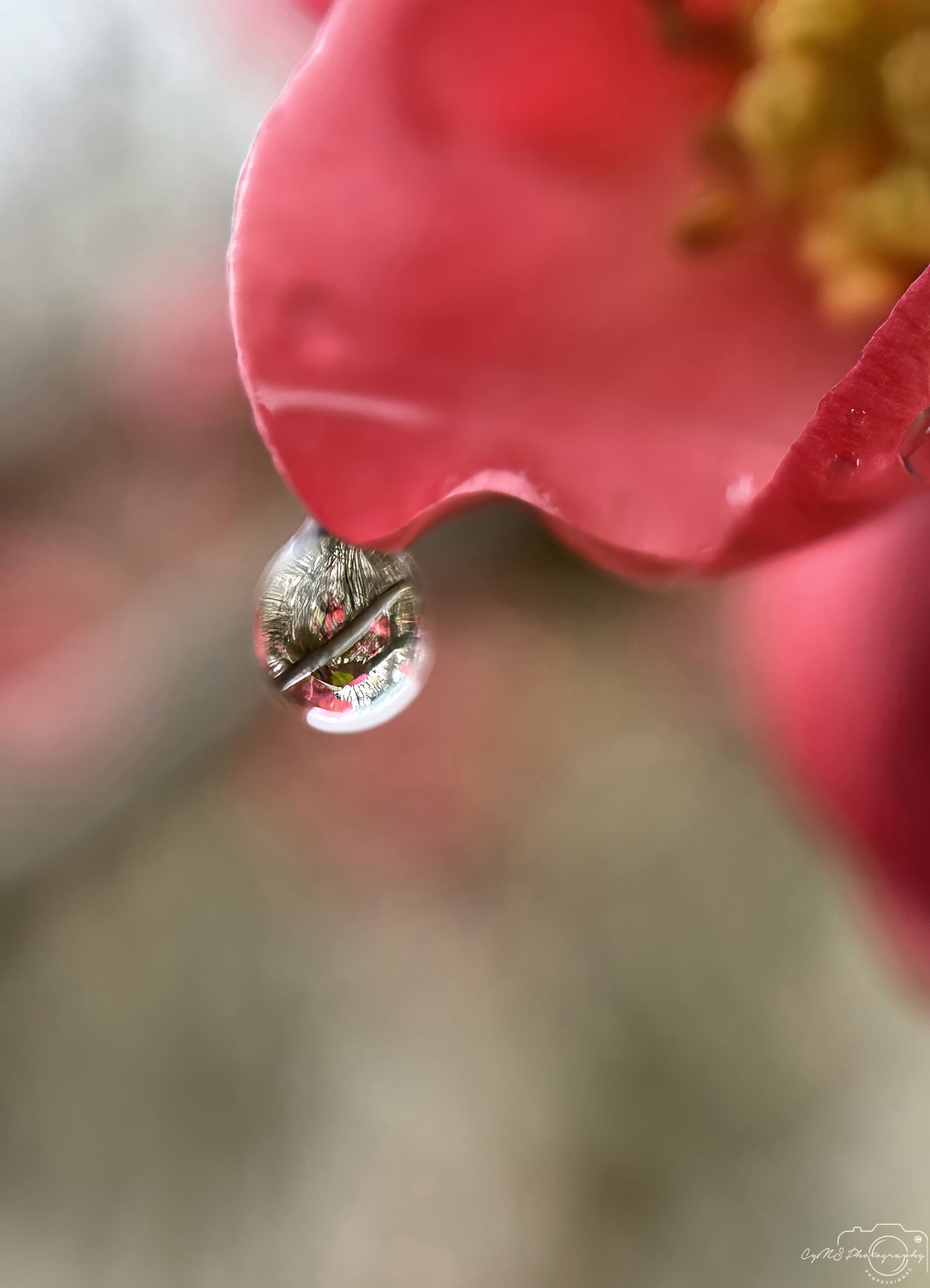 In dieser Makroaufnahme ruht ein einzelner großer Tropfen auf den zarten Blütenblättern einer Chaenomeles speciosa . Der Tropfen glänzt wunderschön, seine Oberfläche spiegelt die Pflanze und ihre leuchtenden Blüten auf atemberaubende Weise. Die satten Farben der Chaenomeles speciosa werden in der Spiegelung perfekt eingefangen, was der Aufnahme zusätzliche Eleganz verleiht und sie wahrhaft faszinierend macht.