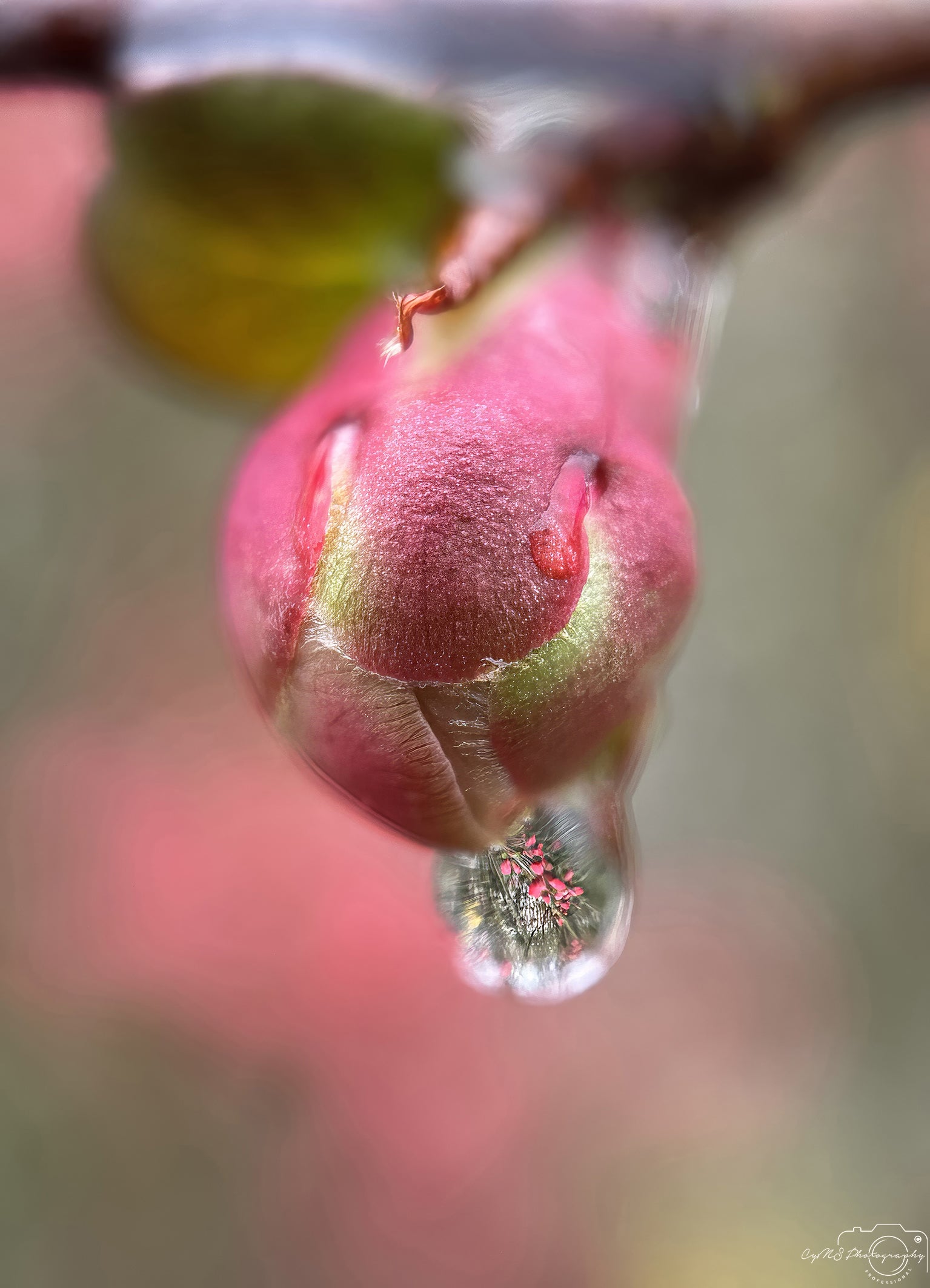 In dieser Makroaufnahme ruht ein einzelner großer Tropfen auf den zarten Blütenblättern einer Chaenomeles japonica . Der Tropfen glänzt wunderschön, seine Oberfläche spiegelt die Pflanze und ihre leuchtenden Blüten auf atemberaubende Weise. Die satten Farben der Chaenomeles japonica werden in der Spiegelung perfekt eingefangen, was der Aufnahme zusätzliche Eleganz verleiht und sie wahrhaft faszinierend macht.
