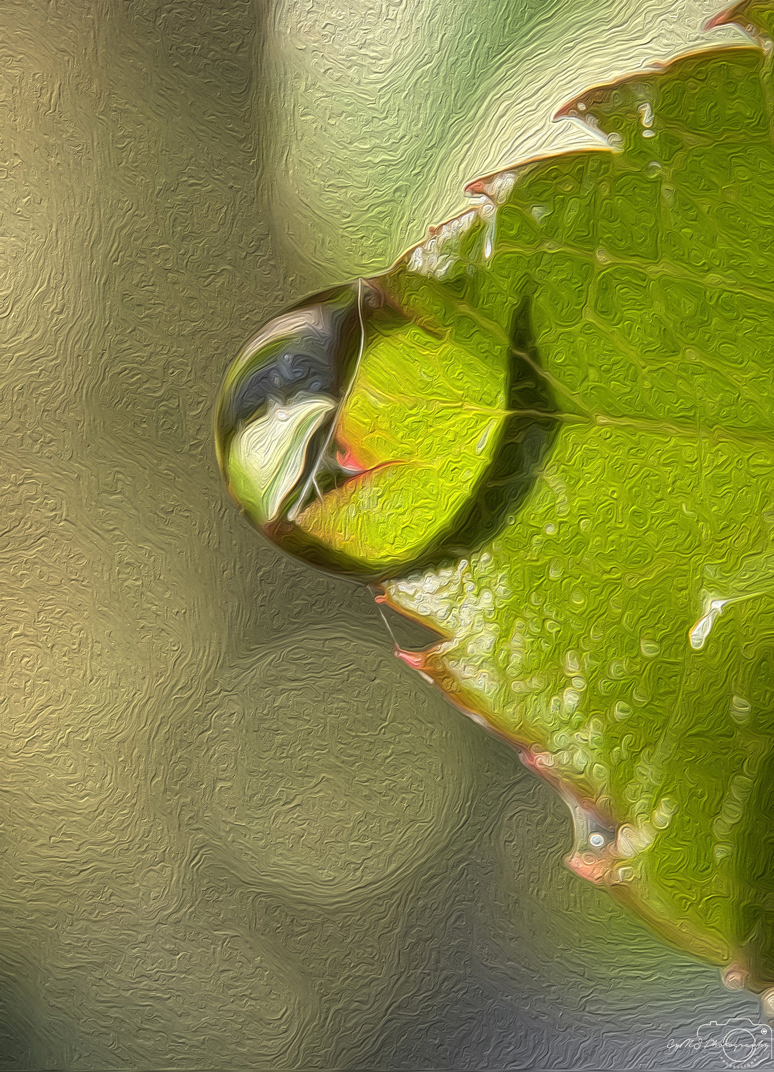 Ein großer Wassertropfen ruht auf einer Rosa sempervirens , deren Oberfläche die umgebenden Farben perfekt reflektiert. Der Tropfen wirkt wie ein Auge, das uns nicht anstarrt, sondern zur Seite blickt und der Szene eine faszinierende und fast geheimnisvolle Note verleiht. Die zarten Blütenblätter der Rose rahmen den Tropfen ein und verstärken den Eindruck von Tiefe und Faszination.