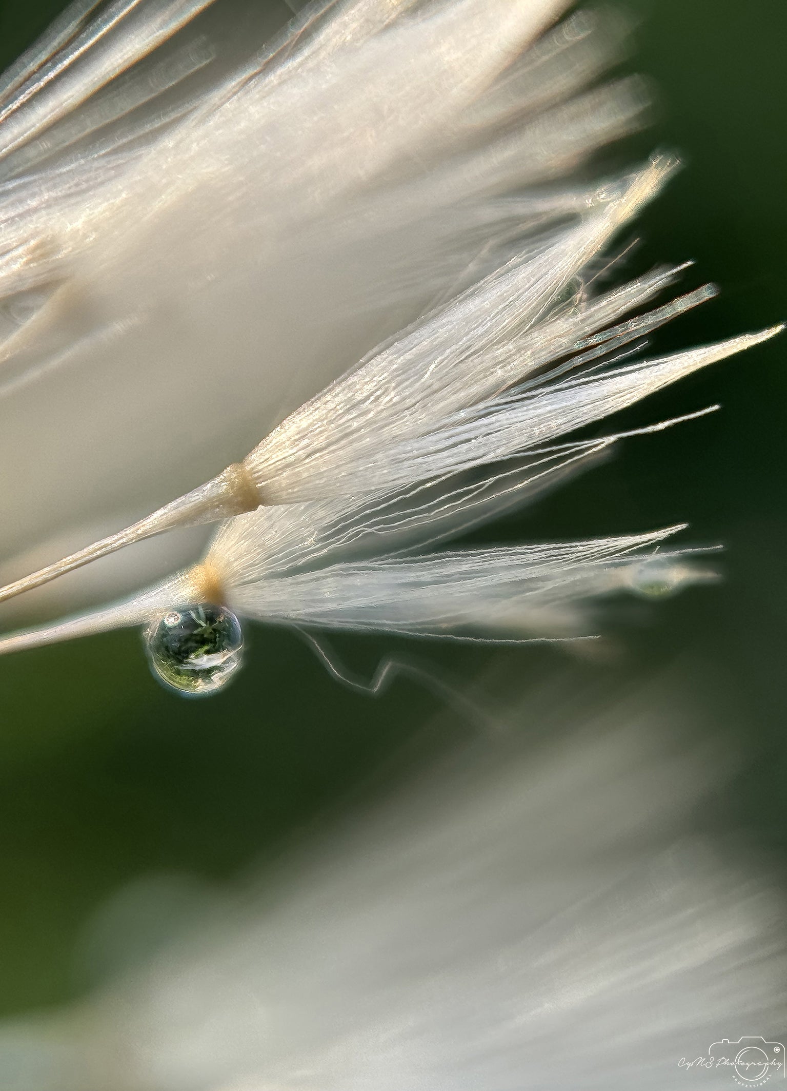 In dieser Nahaufnahme eines Löwenzahns ruht ein winziger Wassertropfen zart zwischen seinen Fäden. Der Anblick ist atemberaubend – eine makellos weiße Blüte, die wie sanftes Licht leuchtet. Jeder Faden fängt das Schimmern des Tages ein und umhüllt den Tropfen wie einen Edelstein. In diesem Tropfen spiegelt sich die Welt in stiller, vollkommener Schönheit.