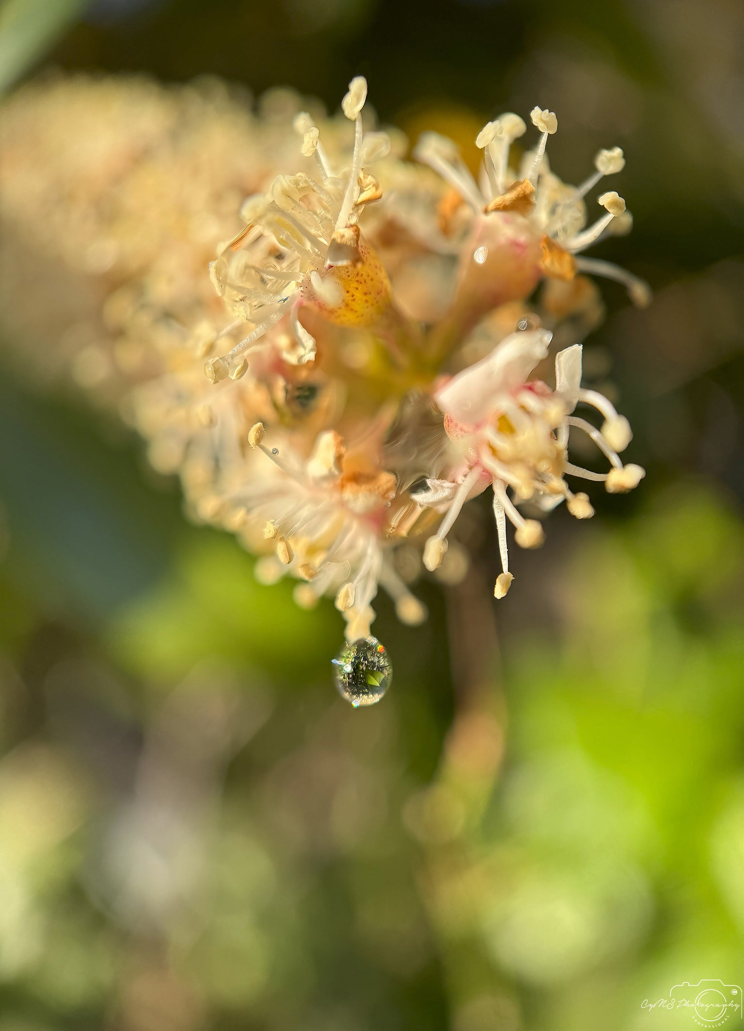 Auf einer Prunus laurocerasus- Blüte ruht ein einzelner kristallklarer Wassertropfen zart auf dem weichen Blütenblatt und fängt die komplizierten Details der umgebenden Blätter und das sanfte Licht ein, das durch die nahegelegenen Zweige fällt, und reflektiert sie, als ob er eine Miniaturwelt auf seiner Oberfläche beherbergen würde – ruhig, still und lebendig mit subtiler Farbe und Bewegung.