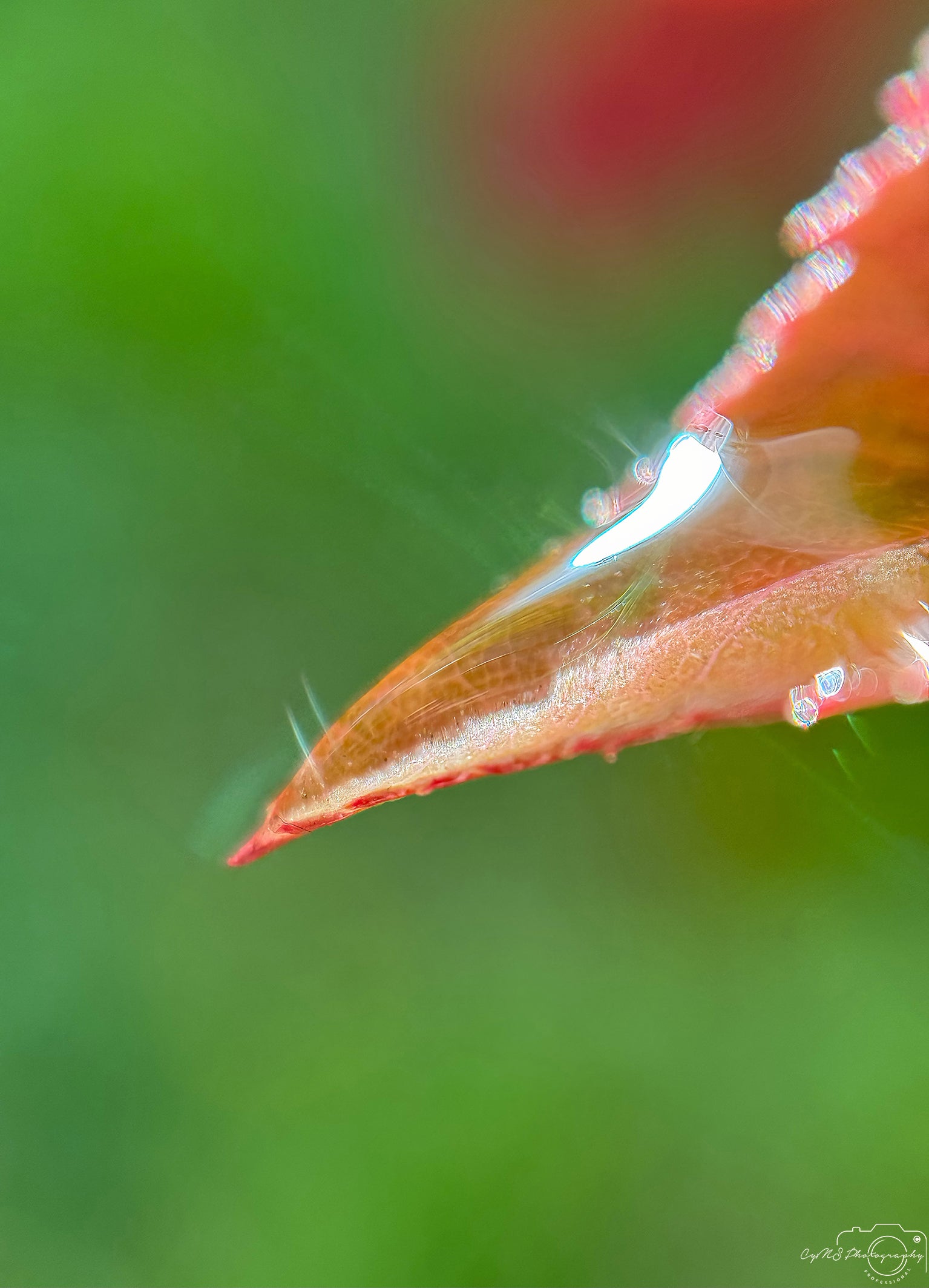 Auf einem Blatt der Photinia × fraseri liegt ein großer, glitzernder Wassertropfen, dessen glatte Oberfläche den leuchtenden Orangeton darunter sanft verzerrt, als ob er die feurigen Töne des Blattes verstärken würde, während er in seiner glasartigen Spiegelung die Ruhe des umgebenden Gartens widerspiegelt.