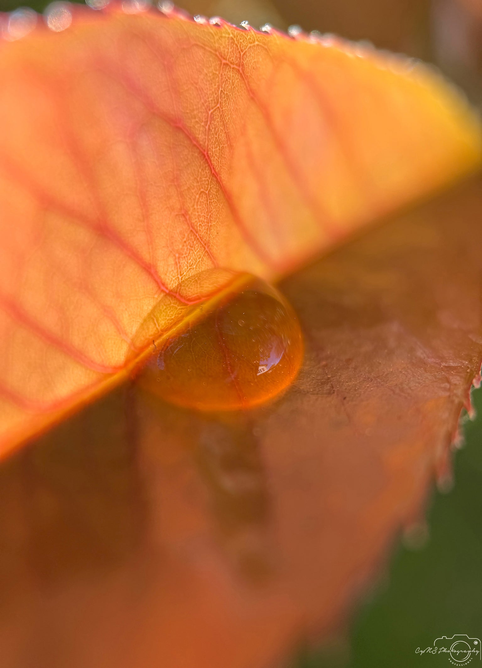 Auf einem Blatt der Photinia × fraseri liegt ein großer, glitzernder Wassertropfen, dessen glatte Oberfläche den leuchtenden Orangeton darunter sanft verzerrt, als ob er die feurigen Töne des Blattes verstärken würde, während er in seiner glasartigen Spiegelung die Ruhe des umgebenden Gartens widerspiegelt.