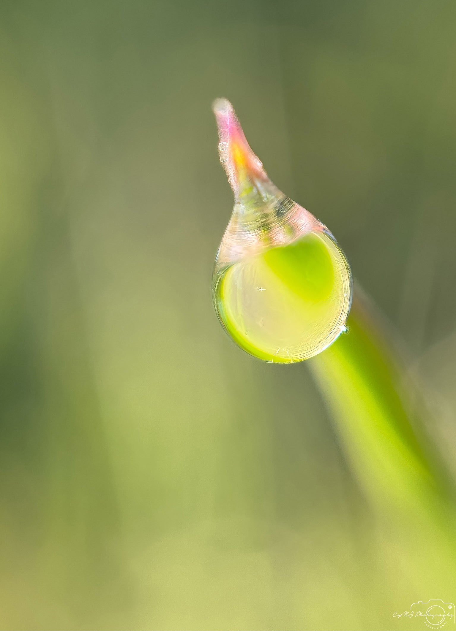 Am frühen Morgen scheint die Sonne bereits sanft auf das Gras und taucht die Szene in ein sanftes, goldenes Licht. Ein erstaunlicher Wassertropfen liegt still auf den Halmen, seine vollkommen glatte Oberfläche spiegelt die umgebende Welt wider. Das umgebende Gras erstrahlt in einem leuchtenden Grün, wie die frische, knackige Farbe eines Granny-Smith-Apfels. Dies schafft eine lebendige und ruhige Atmosphäre, in der die Natur in stiller Bewunderung des Morgenrots innezuhalten scheint.
