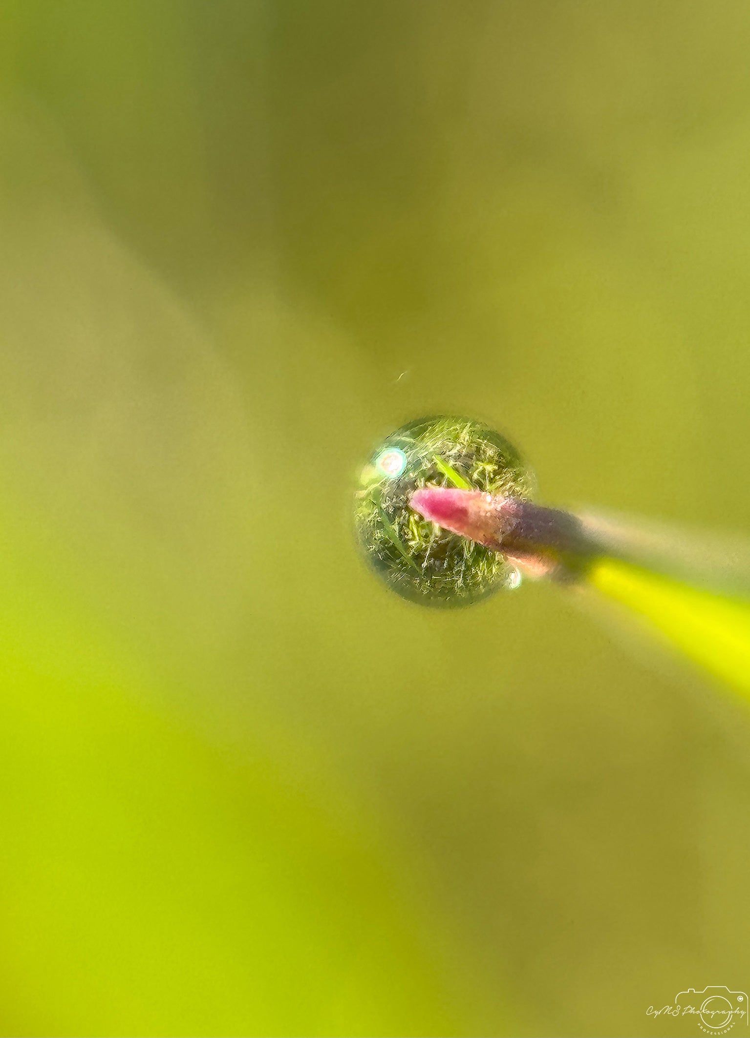 Am frühen Morgen scheint die Sonne bereits sanft auf das Gras und taucht die Szene in ein sanftes, goldenes Licht. Ein erstaunlicher Wassertropfen liegt still auf den Halmen, seine vollkommen glatte Oberfläche spiegelt die umgebende Welt wider. Das umgebende Gras erstrahlt in einem leuchtenden Grün, wie die frische, knackige Farbe eines Granny-Smith-Apfels. Dies schafft eine lebendige und ruhige Atmosphäre, in der die Natur in stiller Bewunderung des Morgenrots innezuhalten scheint.