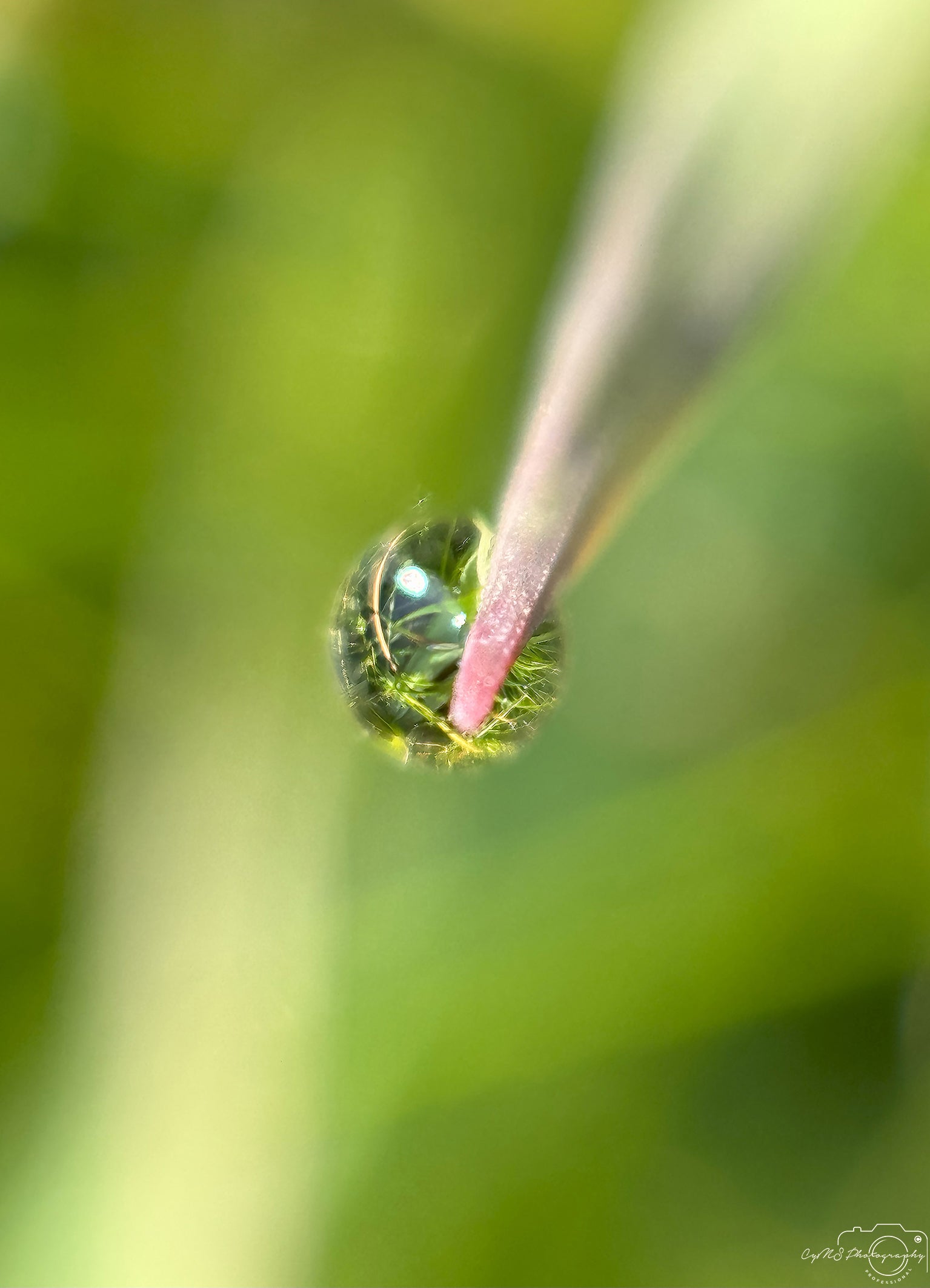 Am frühen Morgen scheint die Sonne bereits sanft auf das Gras und taucht die Szene in ein sanftes, goldenes Licht. Ein erstaunlicher Wassertropfen liegt still auf den Halmen, seine vollkommen glatte Oberfläche spiegelt die umgebende Welt wider. Das umgebende Gras erstrahlt in einem leuchtenden Grün, wie die frische, knackige Farbe eines Granny-Smith-Apfels. Dies schafft eine lebendige und ruhige Atmosphäre, in der die Natur in stiller Bewunderung des Morgenrots innezuhalten scheint.