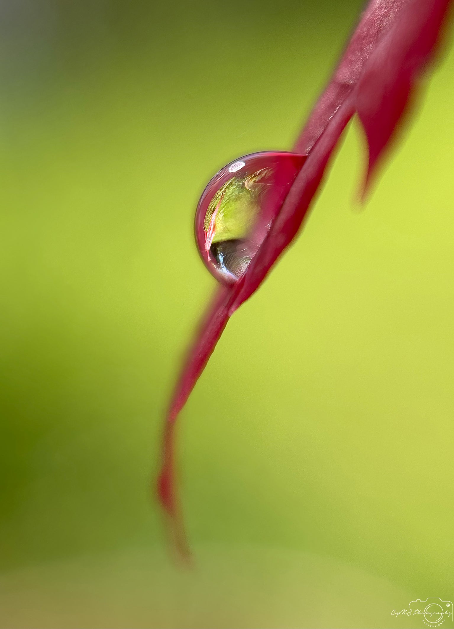 Ein einzelner Wassertropfen liegt auf dem Blatt eines Acer palmatum . Vollkommen klar spiegelt er die leuchtenden Rottöne des Blattes und der umgebenden Welt wider. Der Tropfen liegt ruhig da und fängt in zarter Stille die Schönheit seiner Umgebung ein, während die leuchtenden Farben des Blattes in seiner Spiegelung schwingen und tanzen.