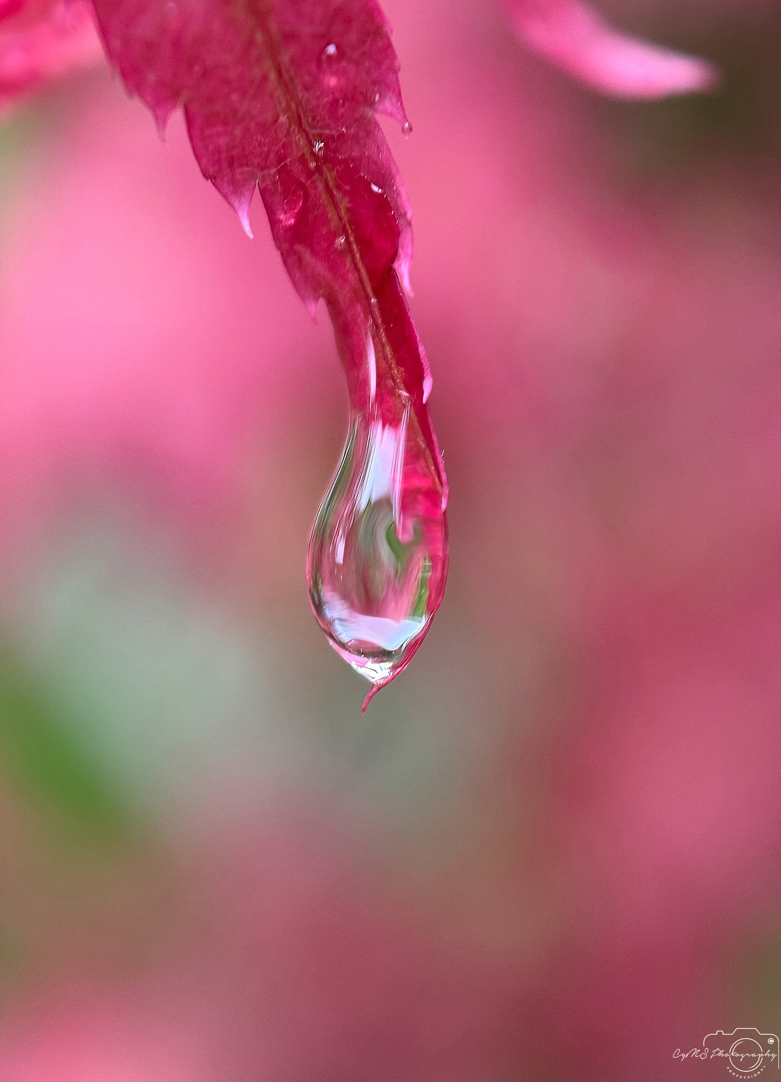Ein einzelner Wassertropfen liegt auf dem Blatt eines Acer palmatum . Vollkommen klar spiegelt er die leuchtenden Rottöne des Blattes und der umgebenden Welt wider. Der Tropfen liegt ruhig da und fängt in zarter Stille die Schönheit seiner Umgebung ein, während die leuchtenden Farben des Blattes in seiner Spiegelung schwingen und tanzen.