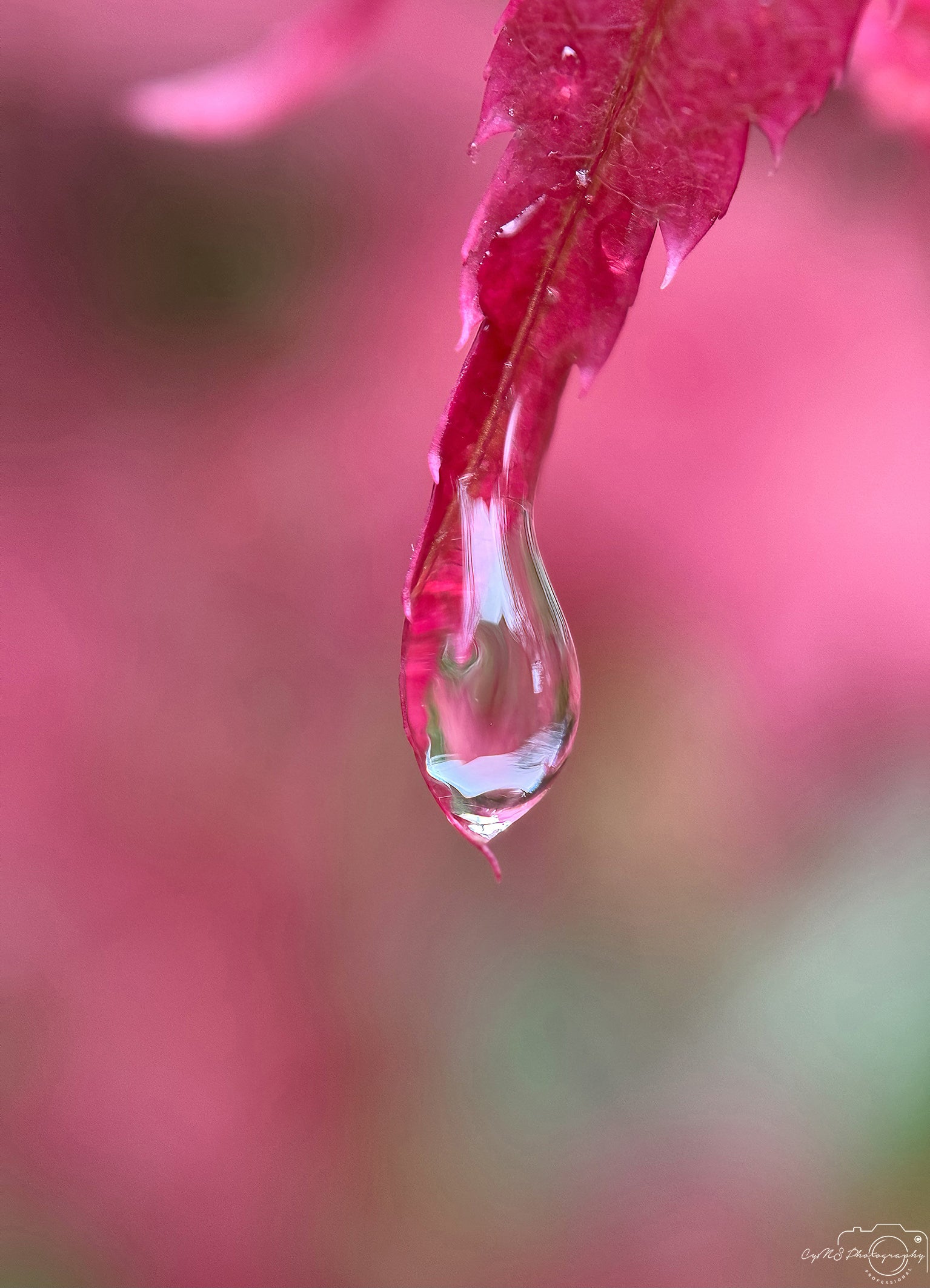 Ein einzelner Wassertropfen liegt auf dem Blatt eines Acer palmatum . Vollkommen klar spiegelt er die leuchtenden Rottöne des Blattes und der umgebenden Welt wider. Der Tropfen liegt ruhig da und fängt in zarter Stille die Schönheit seiner Umgebung ein, während die leuchtenden Farben des Blattes in seiner Spiegelung schwingen und tanzen.