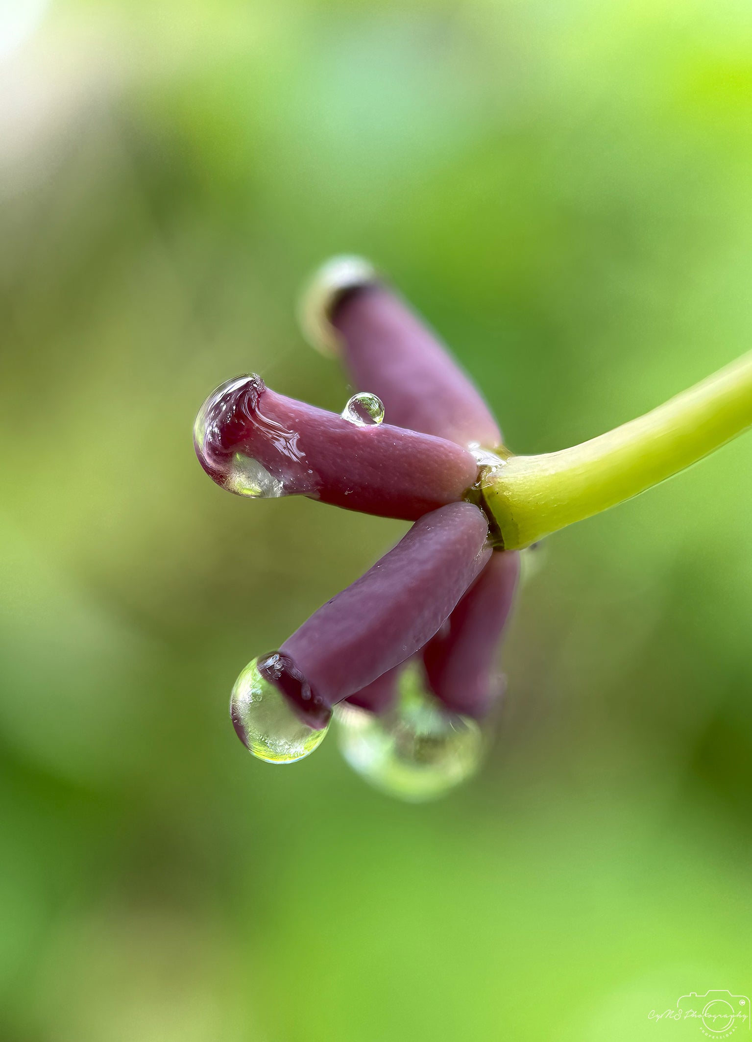 Ein einzelner Wassertropfen ruht sanft auf dem Blütenblatt der Akebia quinata . Die zartviolette Blüte umschließt ihn wie ein Edelstein, vollkommen still und ausgeglichen. Seine Oberfläche spiegelt die umgebende Welt in zarten Details wider und fängt einen flüchtigen Moment der Ruhe ein. Die schlanken Ranken der Rebe winden sich in der Nähe, doch nichts stört den Tropfen, während er in stiller Harmonie von der anmutigen Blüte gehalten wird.