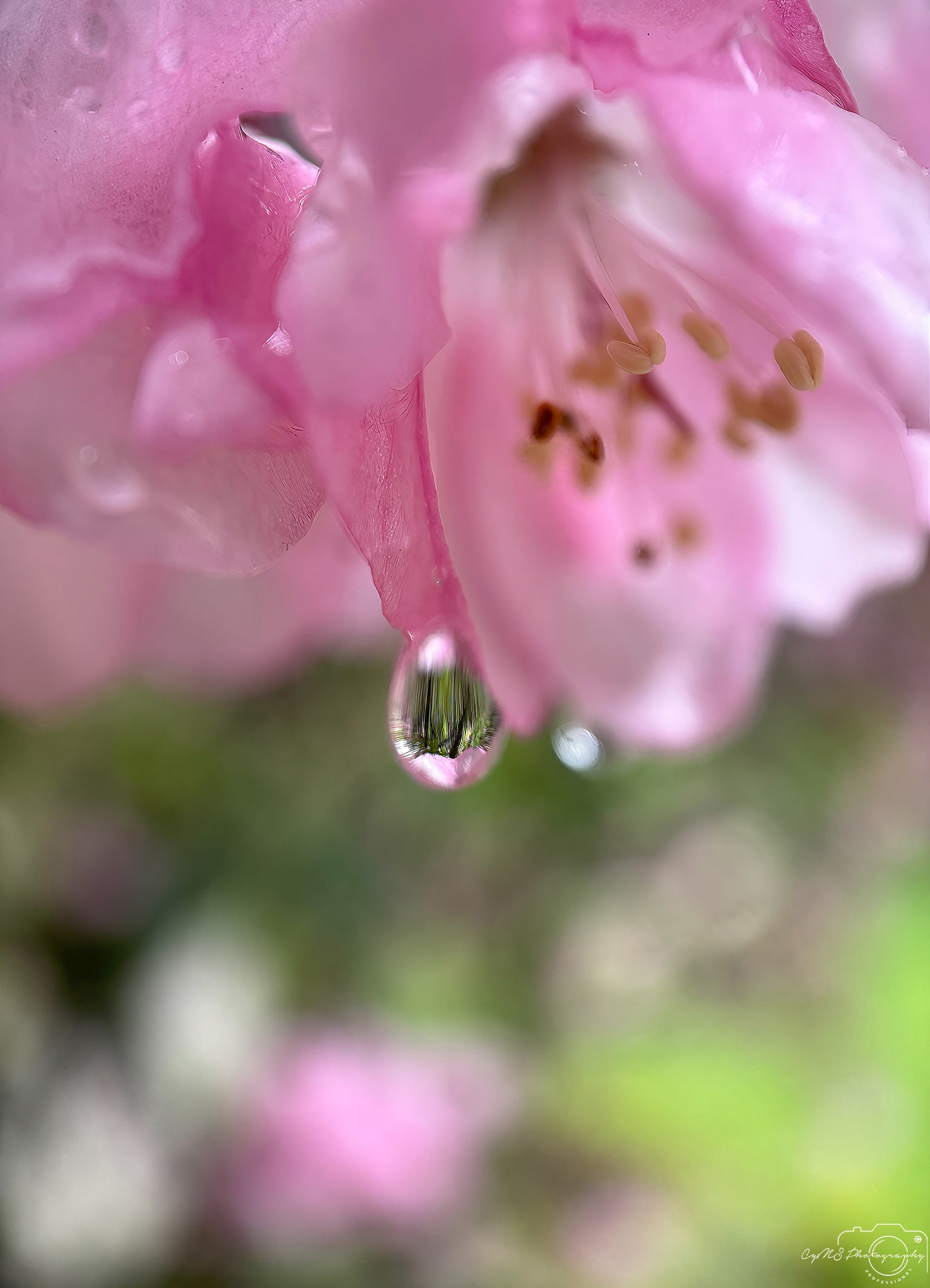 Auf einer Malus halliana- Blüte liegt ein wunderschöner Wassertropfen zart auf einem der zartrosa Blütenblätter. Der Tropfen glitzert wie ein kleines Juwel und spiegelt die umgebenden Blütenblätter in seiner Oberfläche wider. Die Blüte mit ihrem zarten Rosaton und der stillen Präsenz des Wassertropfens wirkt in diesem flüchtigen Moment noch anmutiger.