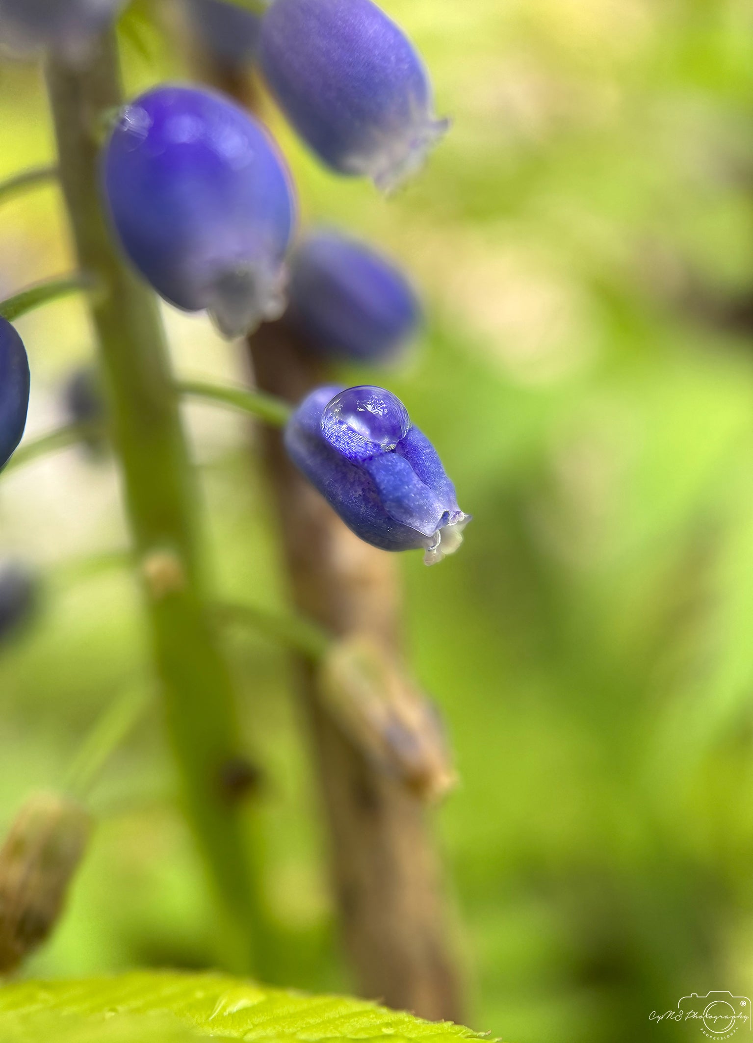 Auf einer Traubenhyazinthe liegt ein prächtiger Wassertropfen. Er sitzt zwischen den Blütenbüscheln und fängt Lichtschimmer in tiefen Violett- und Blautönen ein. Die winzigen Blüten scheinen sich um ihn zu sammeln, als wäre der Tropfen ein Geheimnis, das im Herzen des Frühlings verborgen liegt.