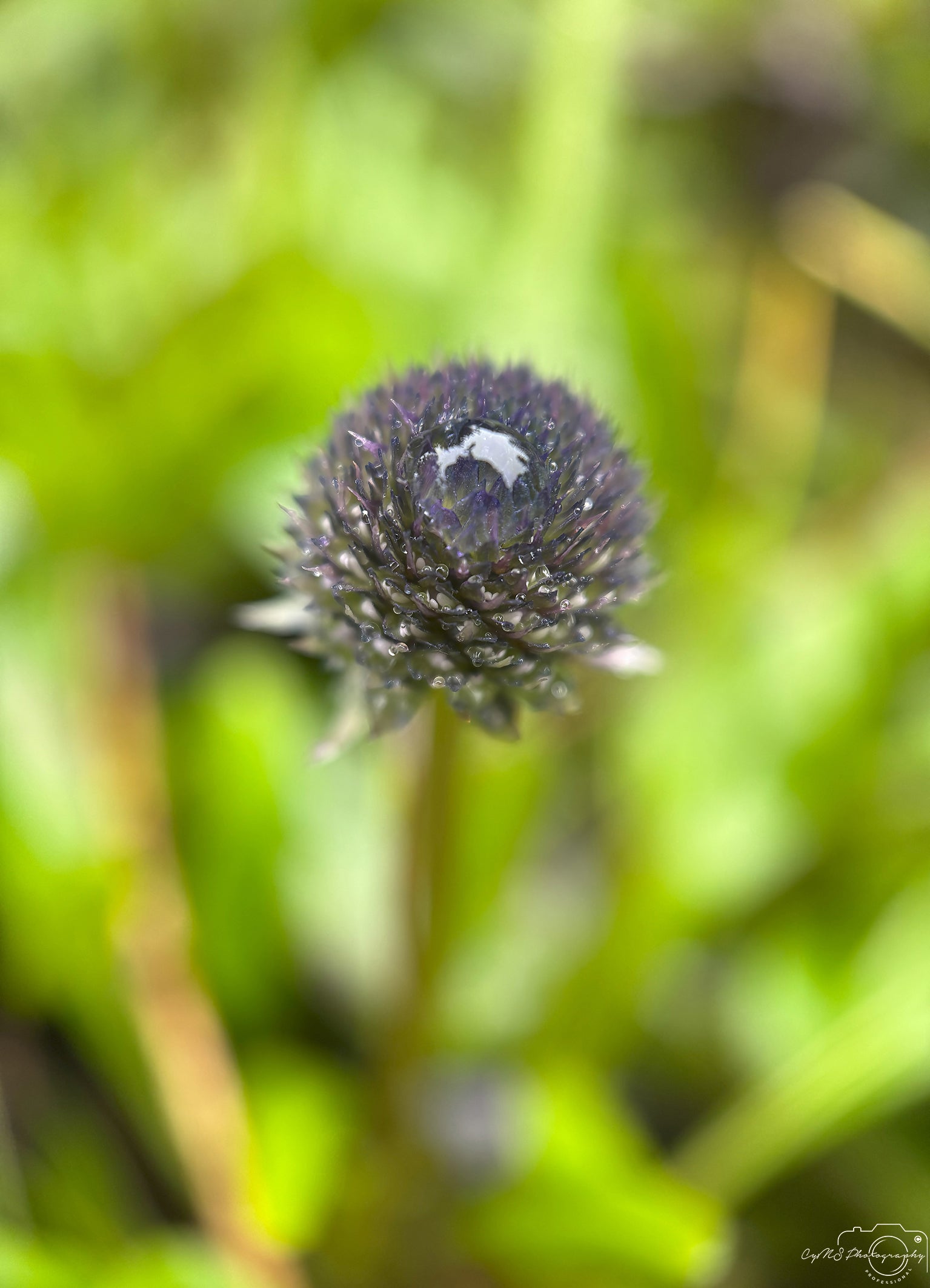 Auf einer Globularia bisnagarica thront ein prächtiger Wassertropfen, zart auf einem ihrer Blütenblätter. Die Farben der Blüte verschmelzen in sanften Weiß- und Lilatönen und bilden einen wunderschönen Kontrast zur Klarheit des Tropfens. Er spiegelt die Essenz der Blüte wider und fängt die stille Eleganz der Natur in einem einzigen, heiteren Moment ein.