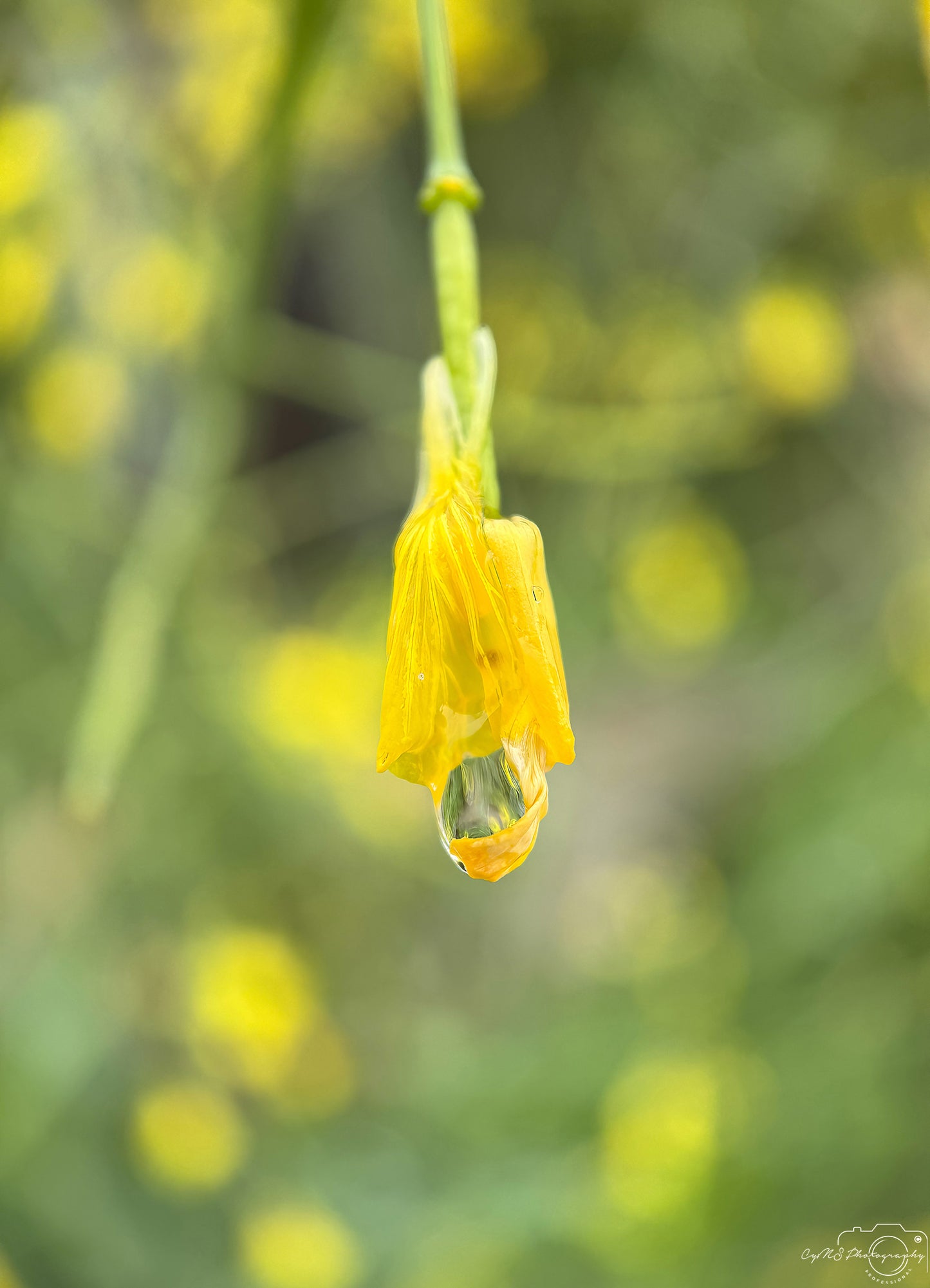 An der Spitze einer leuchtend gelben Blüte einer Brassica nigra liegt ein schöner Wassertropfen. Er ruht sanft, seine klare Oberfläche spiegelt die umgebenden Blütenblätter und bildet einen zarten Kontrast zum leuchtenden Gelb. Der Tropfen wirkt, als wäre er von einem weichen, gelben Bettlaken umgeben. Die Blütenblätter verschmelzen nahtlos um ihn herum und verleihen dem ruhigen Moment einen warmen, sanften Rahmen.
