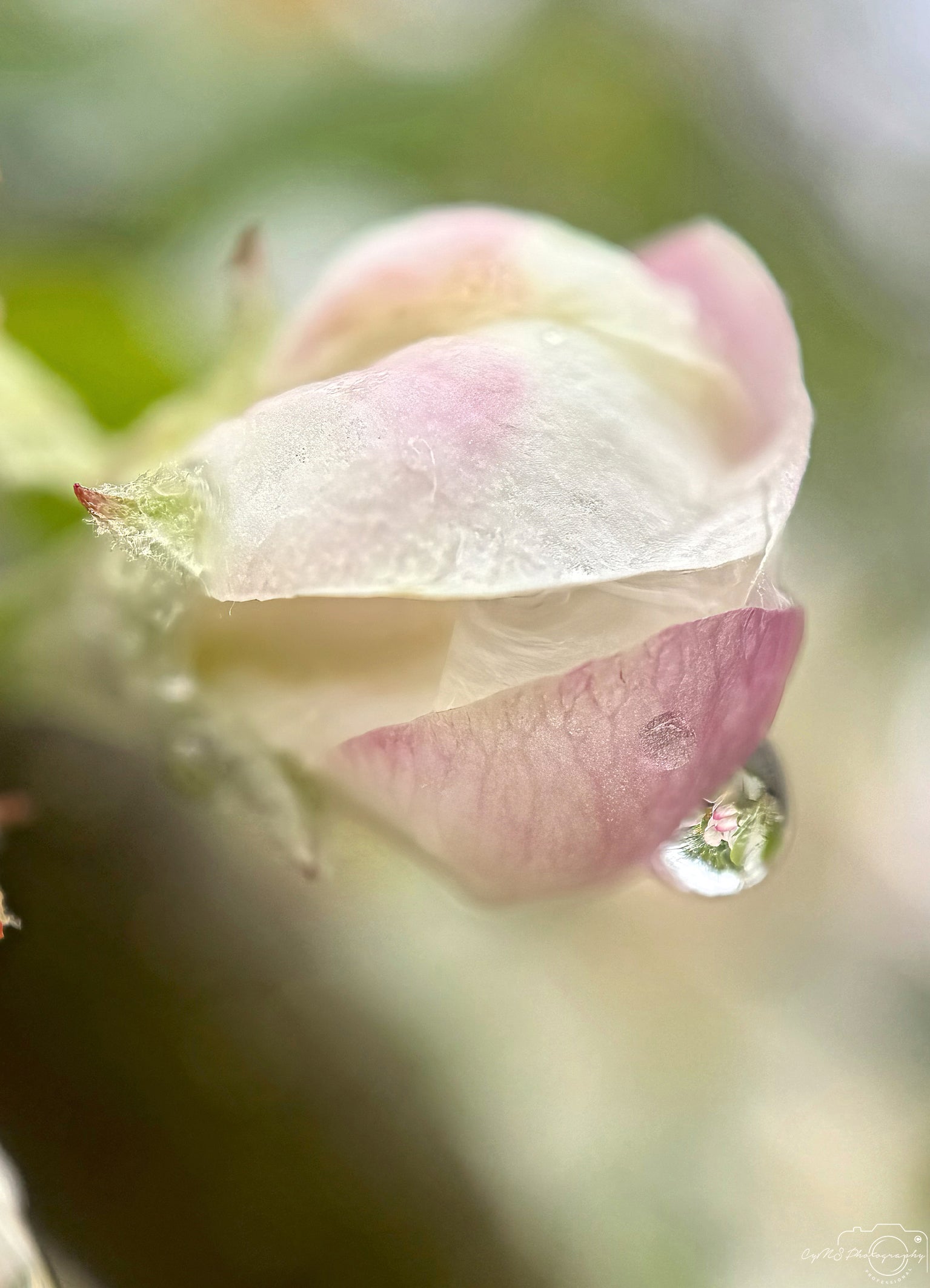 Auf dieser Blume, die wie eine Rose aussieht, aber tatsächlich ein Malus sylvestris ist, liegt ein kleiner, perfekt abgerundeter Wassertropfen. Seine zarte Form fängt das Licht ein und verleiht den blassrosa Blütenblättern einen funkelnden Touch. Die sanfte Rundung des Tropfens bildet einen wunderschönen Kontrast zu den sanften Farbtönen und fängt einen Moment heiterer Stille inmitten der Blüte ein.