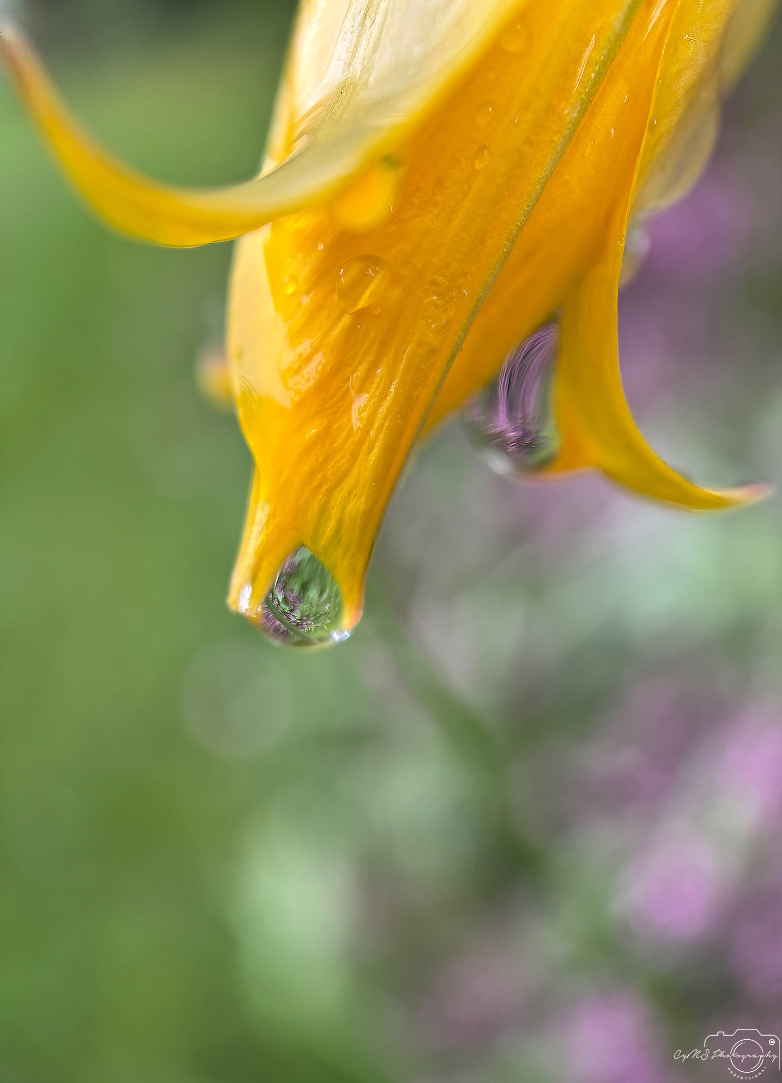 Auf einer Tulipa sylvestris liegen einige Wassertropfen, jeder einzelne spiegelt seine Umgebung. Inmitten dieser Spiegelungen sind die leuchtend violetten Blüten in der Nähe bildhaft eingefangen, deren satte Farben in den Tropfen tanzen. Der Kontrast zwischen dem sanften Gelb der Tulpe und den tiefvioletten Farbtönen der Tropfen erzeugt ein eindrucksvolles, harmonisches Bild der zarten Kunstfertigkeit der Natur.