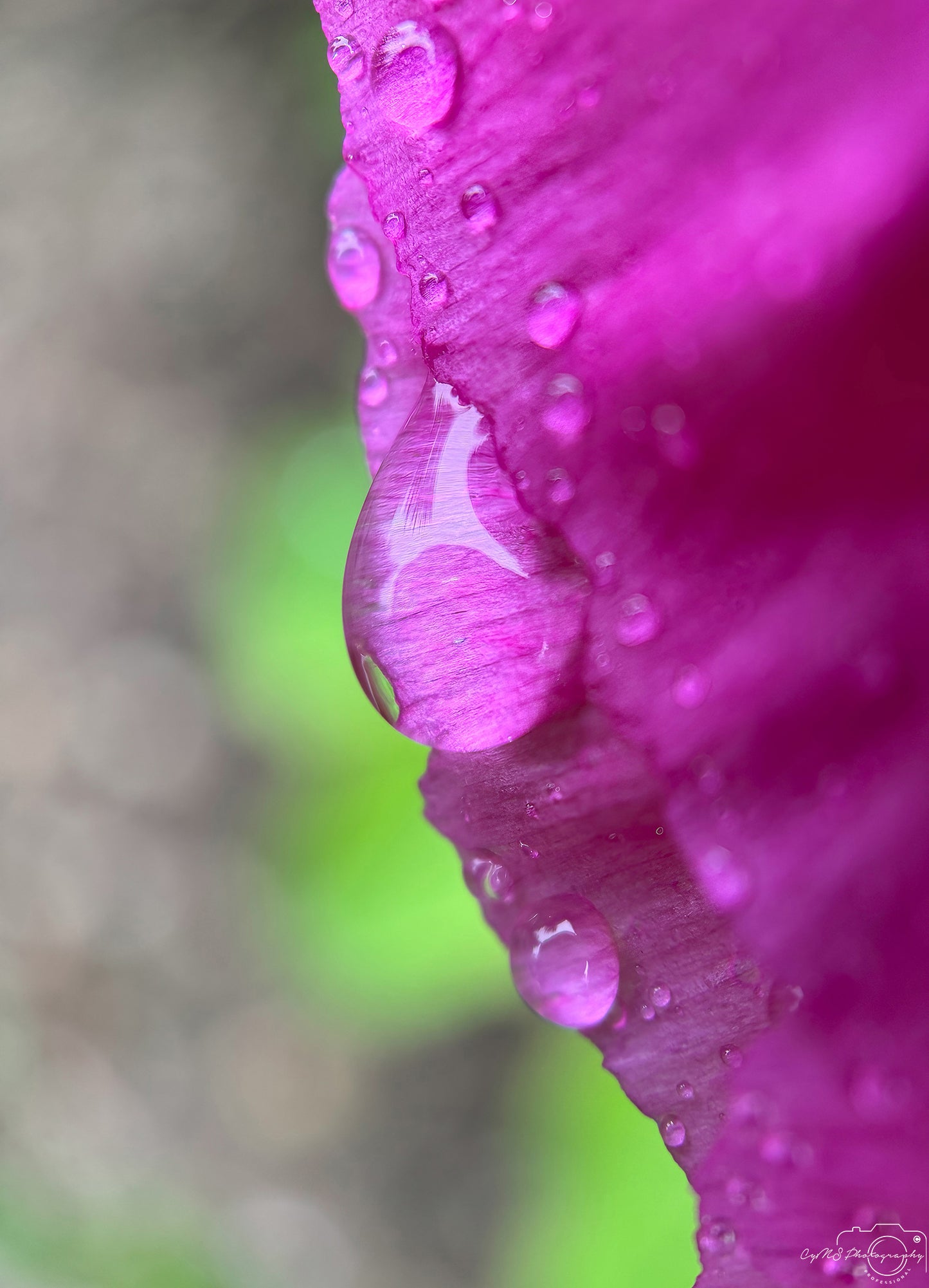 An einem Tag mit starkem Regen entstand eine Makroaufnahme einer Paeonia officinalis , deren leuchtend rosa Blütenblätter einfach atemberaubend sind. Der Fokus ist so nah, dass die Blüte nicht vollständig zu sehen ist, die auf der Oberfläche verstreuten Wassertropfen jedoch detailreich eingefangen werden. Ihre kristallklare Klarheit hebt sich von den leuchtenden Farben der Blütenblätter ab und erzeugt eine atemberaubende Nahaufnahme, die die Schönheit des Augenblicks unterstreicht.