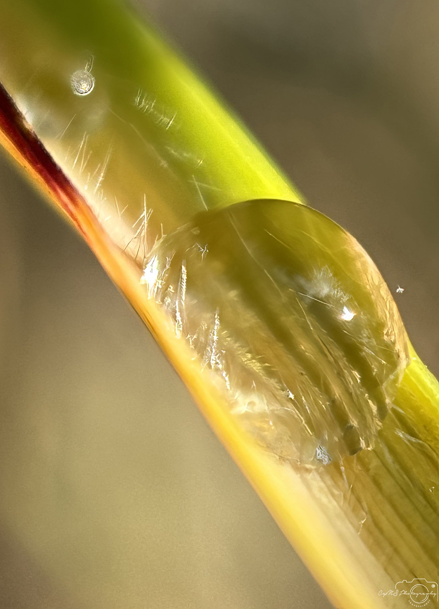 Auf der Spitze eines Zweiges liegt ein Wassertropfen. Die Spiegelung und die Art und Weise, wie der Tropfen auf dem Zweig ruht, erzeugen eine faszinierende Form. Die Makroaufnahme rückt jedes Detail in den Fokus – die zarte Rundung des Zweiges, geschmückt mit Gelb- und Brauntönen, leicht gebogen unter der schweren Last der Wassertropfen. Die einzigartige Form des Tropfens, kombiniert mit der Schärfe der Spiegelung, lenkt den Blick des Betrachters auf das zarte Gleichgewicht der Natur, hervorgehoben durch die warmen, erdigen Töne.
