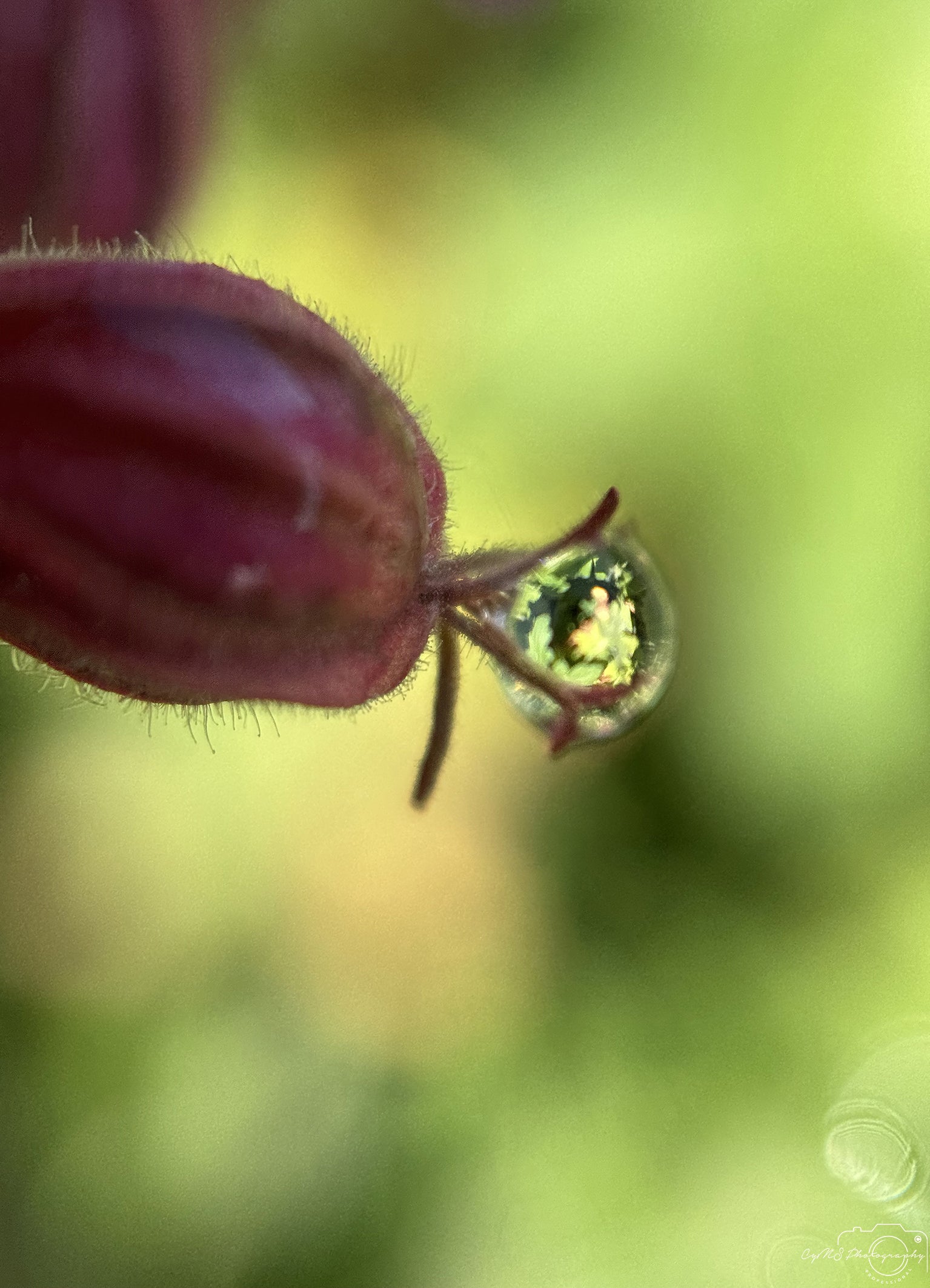 Ein einzelner Tautropfen ruht zart auf der Spitze der Geranium macrorrhizum -Blüte und glitzert im Licht, als hätte ein Juwelier einen makellosen Edelstein auf ihr Blütenblatt gelegt. Der winzige Tropfen fängt seine Umgebung ein und bricht sie. So verwandelt er das einfachste Element der Natur in ein strahlendes Ornament und krönt die Blüte mit stiller Eleganz.