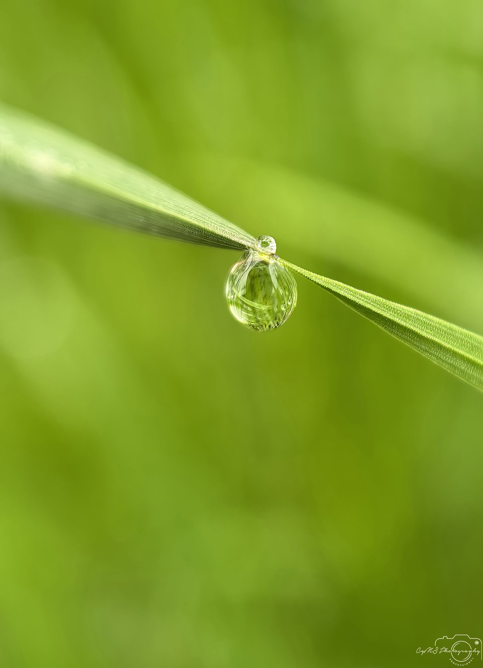 Ein einzelner Tautropfen balanciert genau zwischen zwei schmalen Grashalmen, seine Präsenz ist zart und doch eindrucksvoll. Das leuchtende Grün des umgebenden Laubes bildet die perfekte Bühne und lässt den Tropfen wie eine winzige Lichtlinse schimmern – ein stilles Wunder inmitten der Morgenstille.