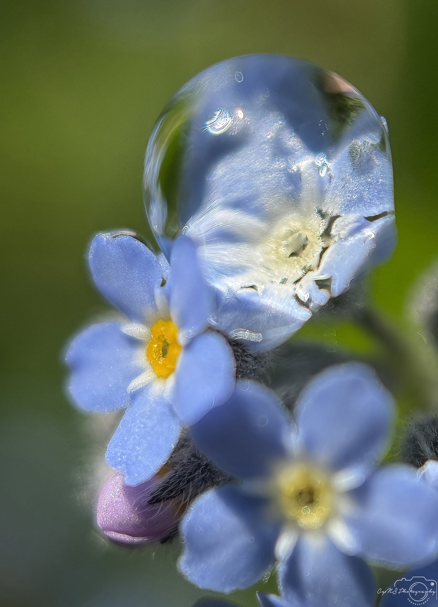 Ein glitzernder Tropfen ruht ruhig auf einem zarten Blütenblatt der Ackermyosotis und fängt das Morgenlicht ein wie ein Juwel in der sanften Umarmung der Sonne. Seine kugelförmige Oberfläche birgt eine Welt der Reflexion und Ruhe in sich.